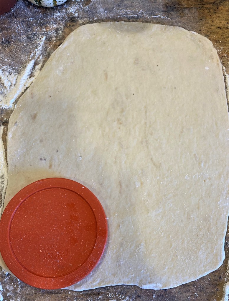 Roll out your dough on a lightly floured surface to about 1/4 inch in thickness. Then cut into circles. I was making these as a main course, so I made bigger circles for bigger pockets. You can make them any size you like.