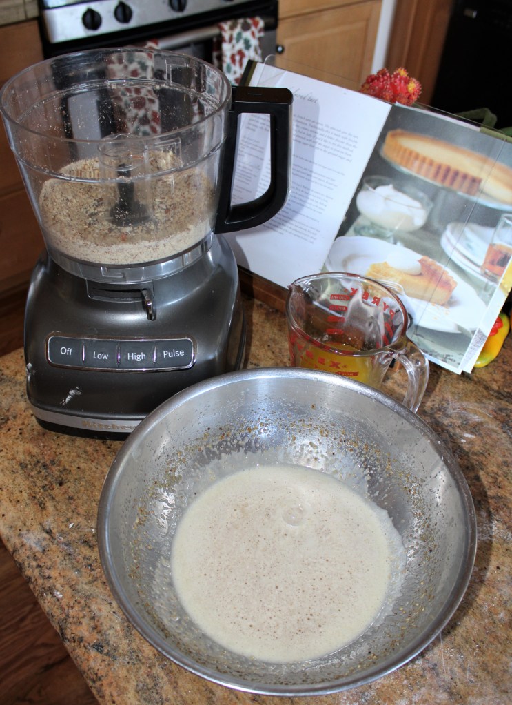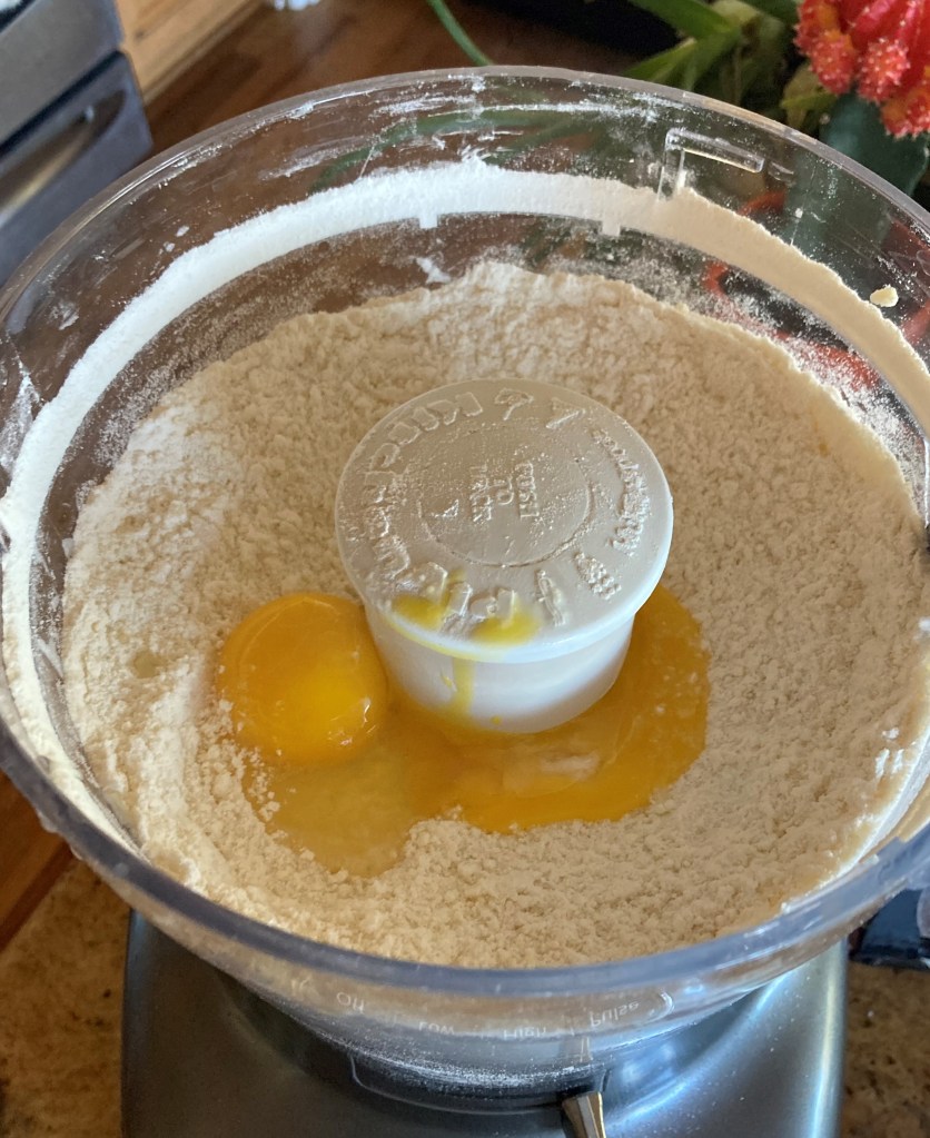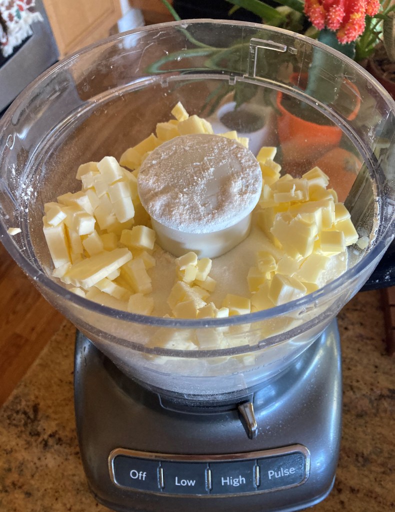 I make my dough in my food processor, but you can mix it or do it by hand too. I mix the flour, sugar and cold butter first until it resembles a crumbly, fine sandy texture.