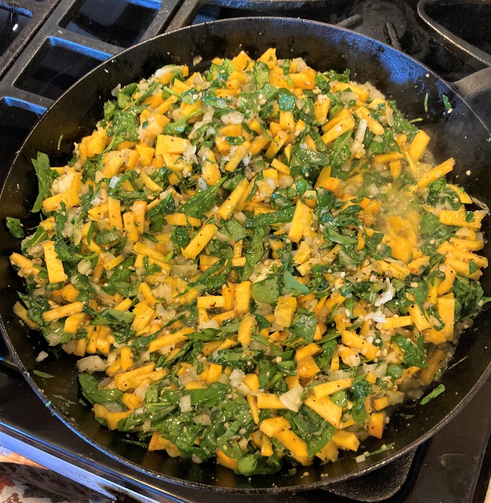 Saute the vegetables and seasonings in the olive oil and butter combination for about 5-7 minutes or until the pumpkin is softened and the onions are translucent.