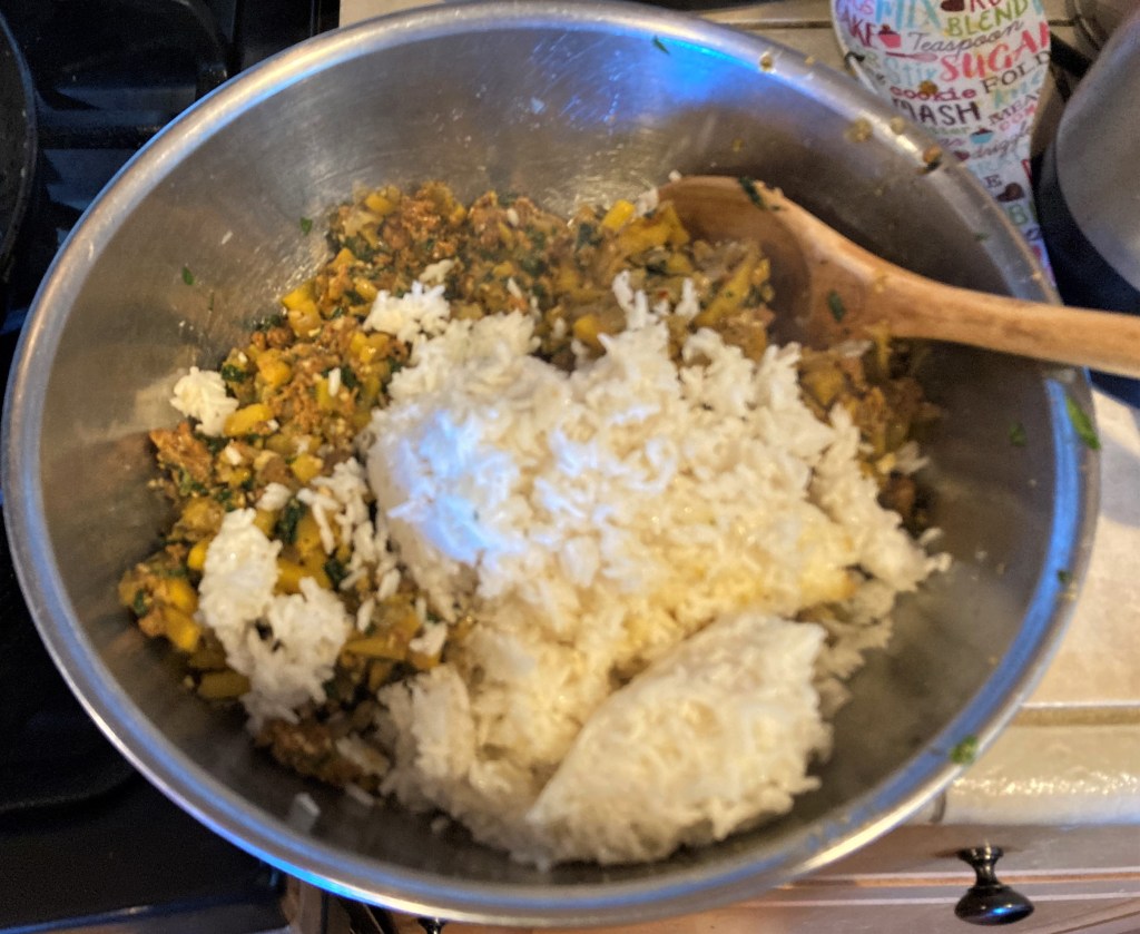 When the sausage mixture is completely cooked, add the rice and combine well.