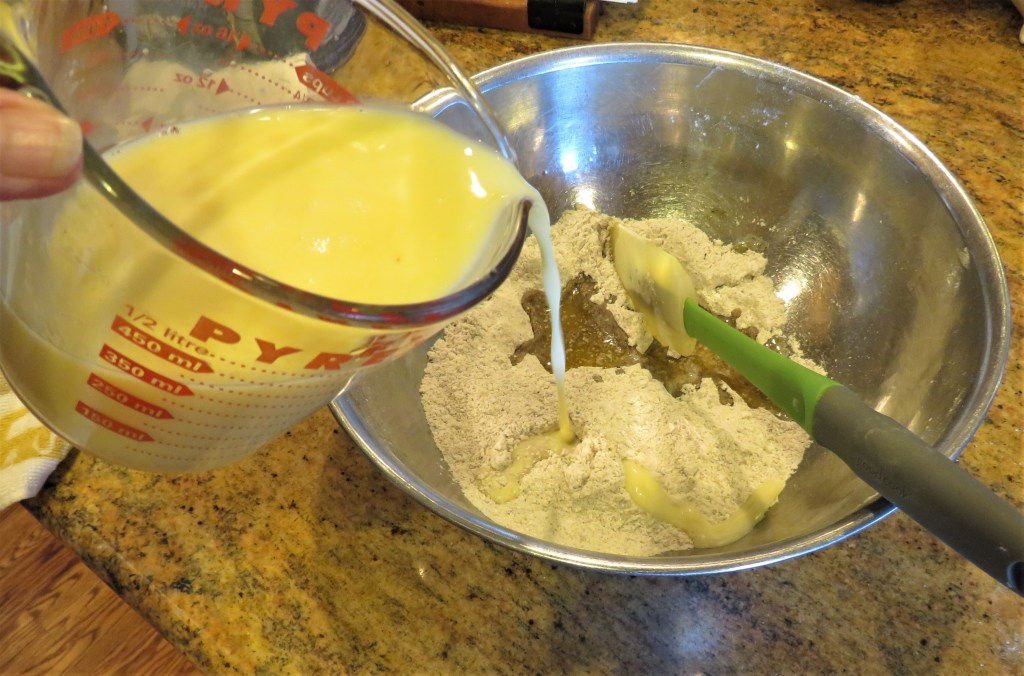 Combine the egg, milk and melted butter and whisk together. Then mix in with the flour mixture and stir just until everything is well combined. Refrigerate for at least 1 hour before using.