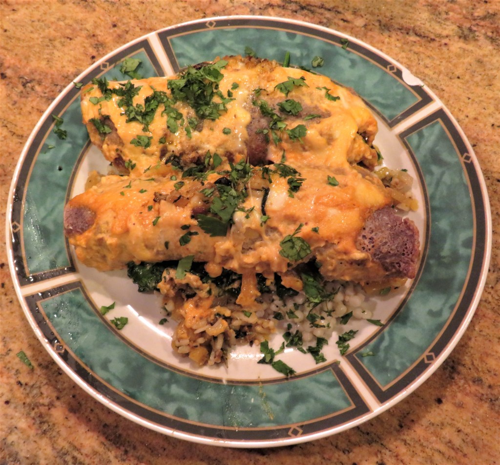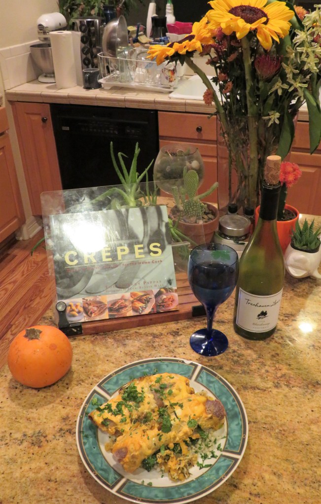 Bake for about 30 minutes, or until the center of the crepes is hot. Serve them up how you like. I served mine over some couscous with a crisp, citrusy chardonnay on the side. C’est manifique! C’es si bonne!
