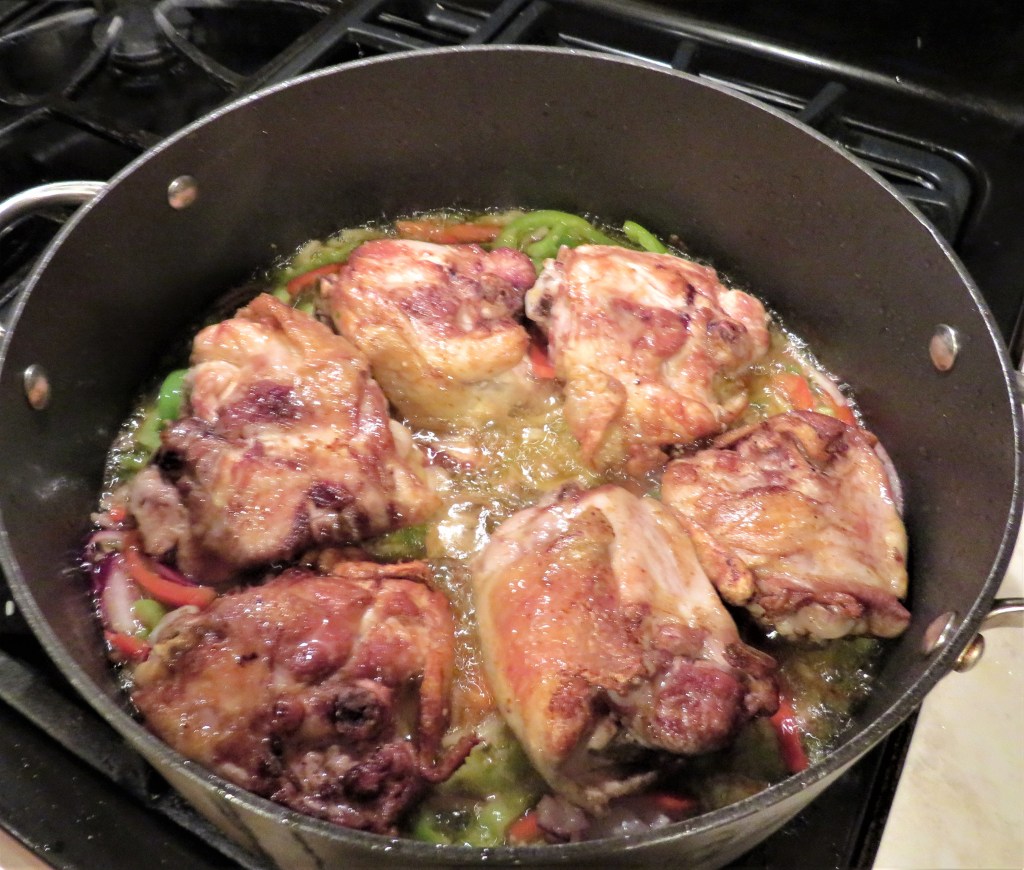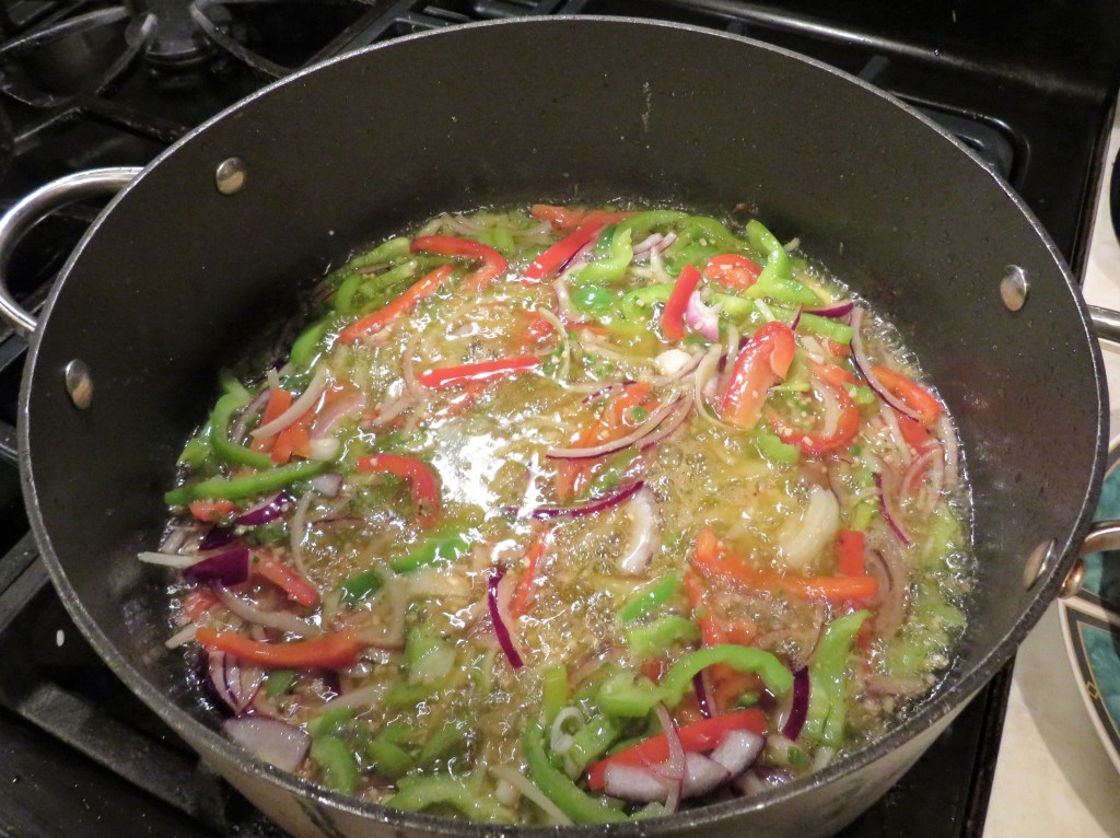 Once the chicken is browned, remove it from the heat and set aside. Add the peppers, onions and garlic to the oil and saute for about 5 minutes, or until softened.