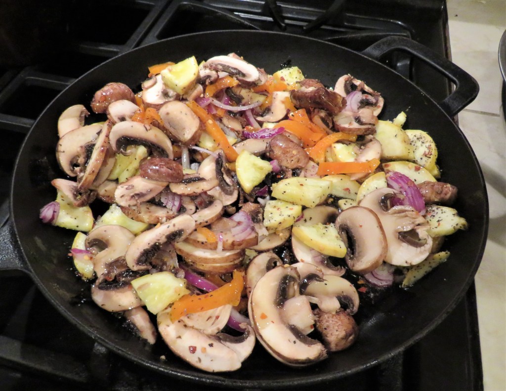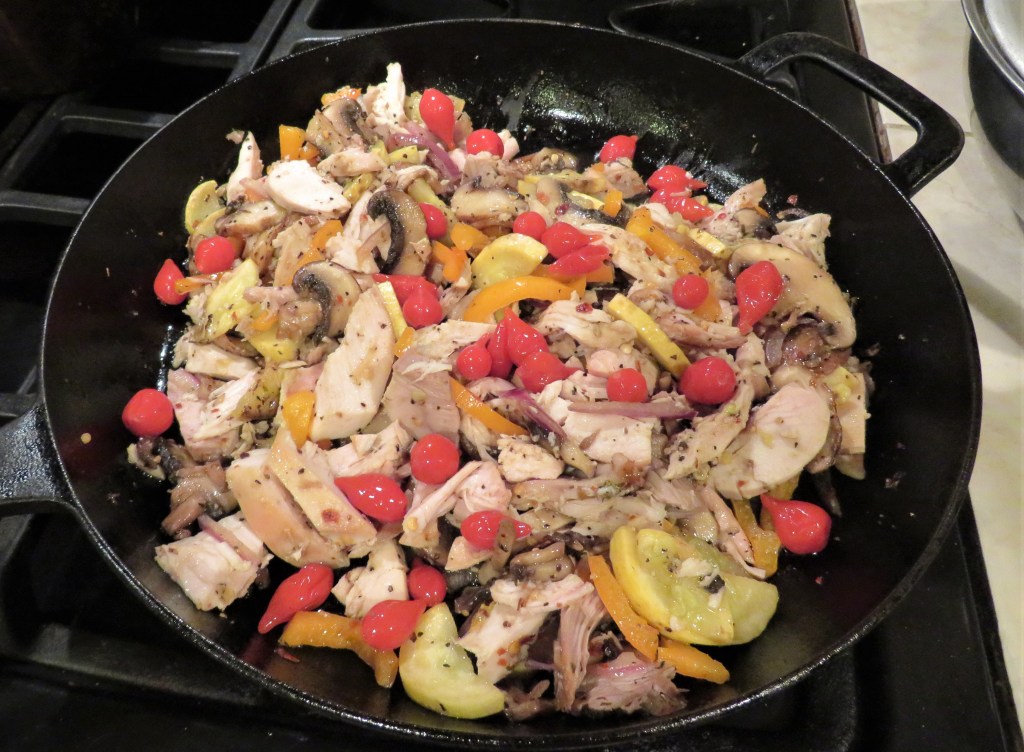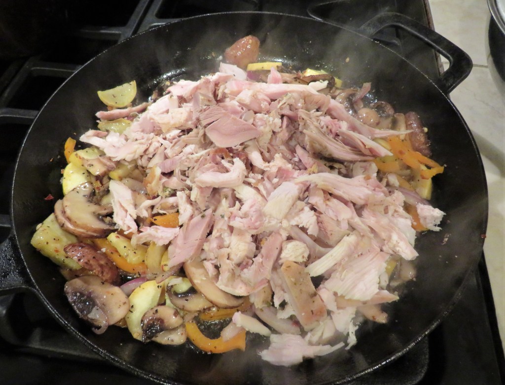 First I used about 3-4 cups of my leftover turkey that I shredded, and then I added mushrooms, bell peppers, red onions, crookneck squash, Peruvian peppers and garlic, along with salt & pepper and olive oil. I sauted those all together until the vegetables were tender.