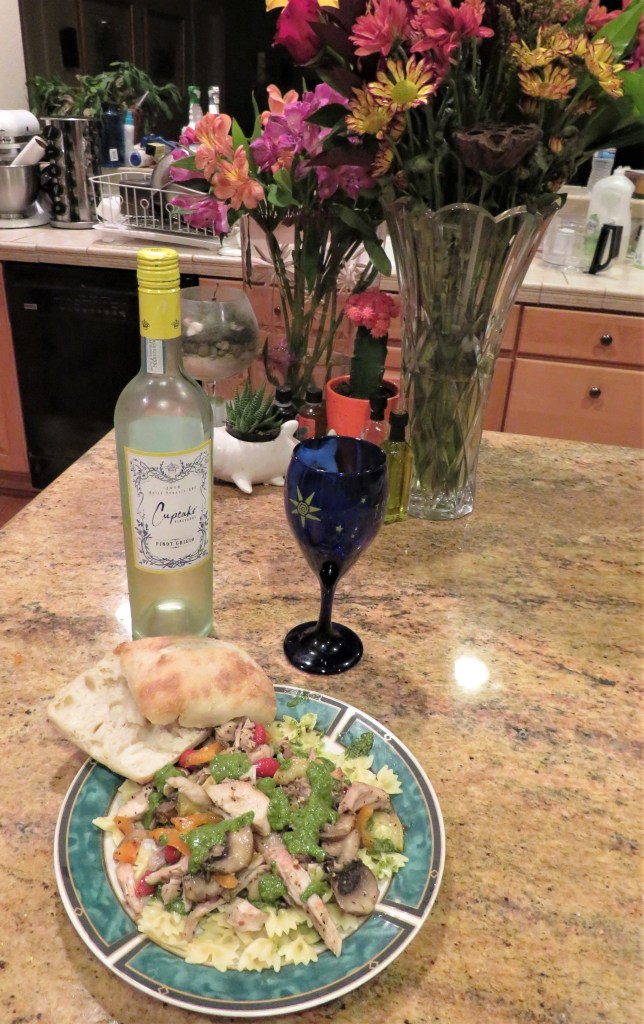 Once everything was cooked I served it all over some farfelle pasta, which I topped with a dab or two of the spinach pesto. I like to layer my pastas, so it was the pasta, pesto, turkey saute, and a bit more pesto sauce, with more Parmigiano cheese on top for Larry. The meal was completed with some warmed ciabiatta rolls and a glass or two of of a light Sauvignon Blanc. AHHHHH! I love it when a meal comes together like this.