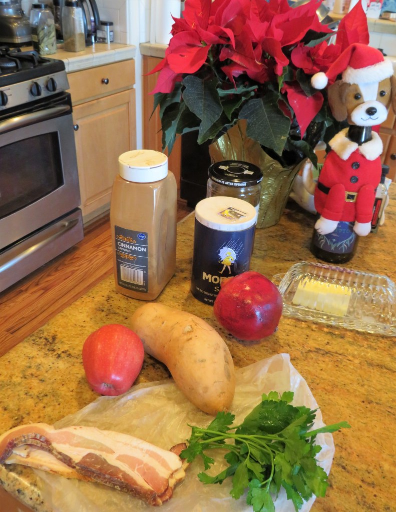 These stuffed yams, or sweet potatoes, can be eaten anytime of day and they will hit the spot. They are loaded with goodness. They were loaded with apple shreds and bacon, topped with more bacon and pomegranate seeds and parsley. Anything with bacon will always be good.