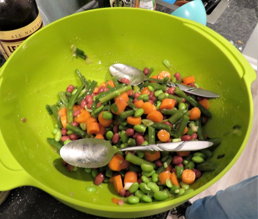 Noah likes to eat healthy foods, and I love to cook healthy foods that taste good. This salad was both. We have certain challenges in Noah’s little studio kitchen, so I trimmed and cooked the green beans at my house and then packaged them up to take with me for our lesson.