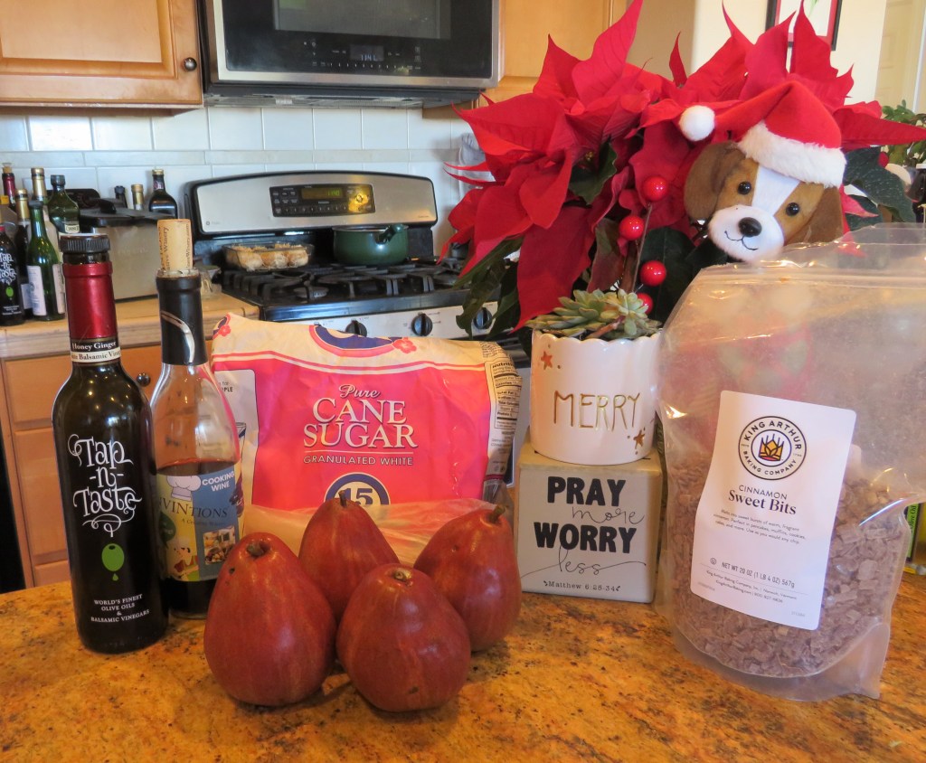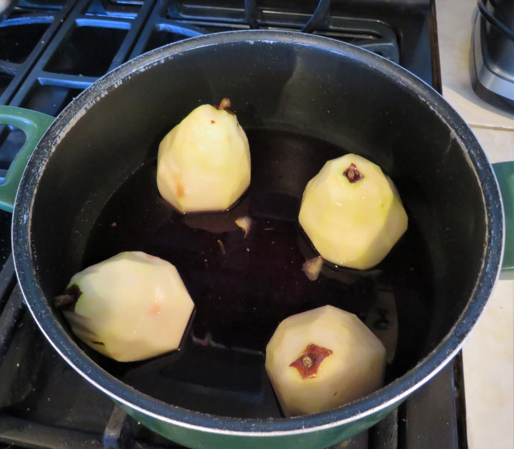 There were only four of us and I used 1 pear per person. I used the red pears, but you can use any kind of pears and any kind of wine you like. Do as I do and mix them up too. I used a reduced port cooking wine this time.