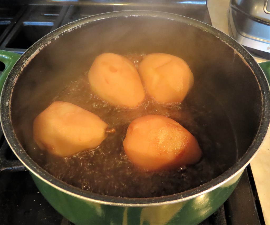 Cover and bring to a full, rapid boil, then reduce the heat and simmer for about 30 minutes or until the pears are tender. Rotate the pears a few times during the cooking process to ensure they cook evenly and completely.