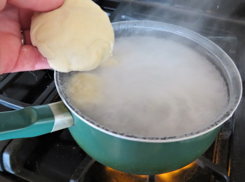 Bring the water and baking soda to a full, rapid boil, then add about 1-3 dough balls into the boiling water and boil for 30 seconds or until the dough balls rise to the surface. Continue until all the dough balls are boiled. If they boil any longer, the buns will have a metallic taste.