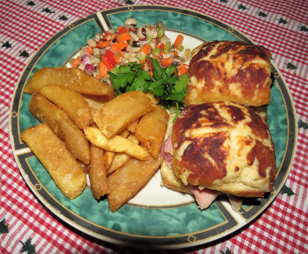 You can eat these buns as is, or you can use them as sliders. We ate them as sliders with the ham I prepared for New Year’s Eve and some honey mustard along with my black-eyed pea salad and some crisp golden steak fries.