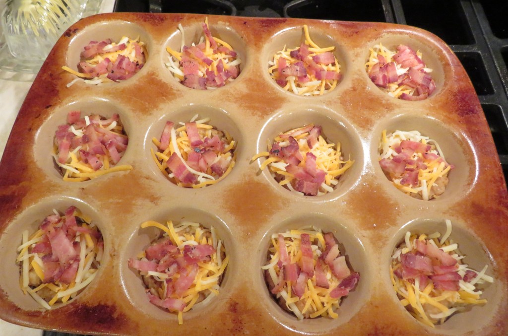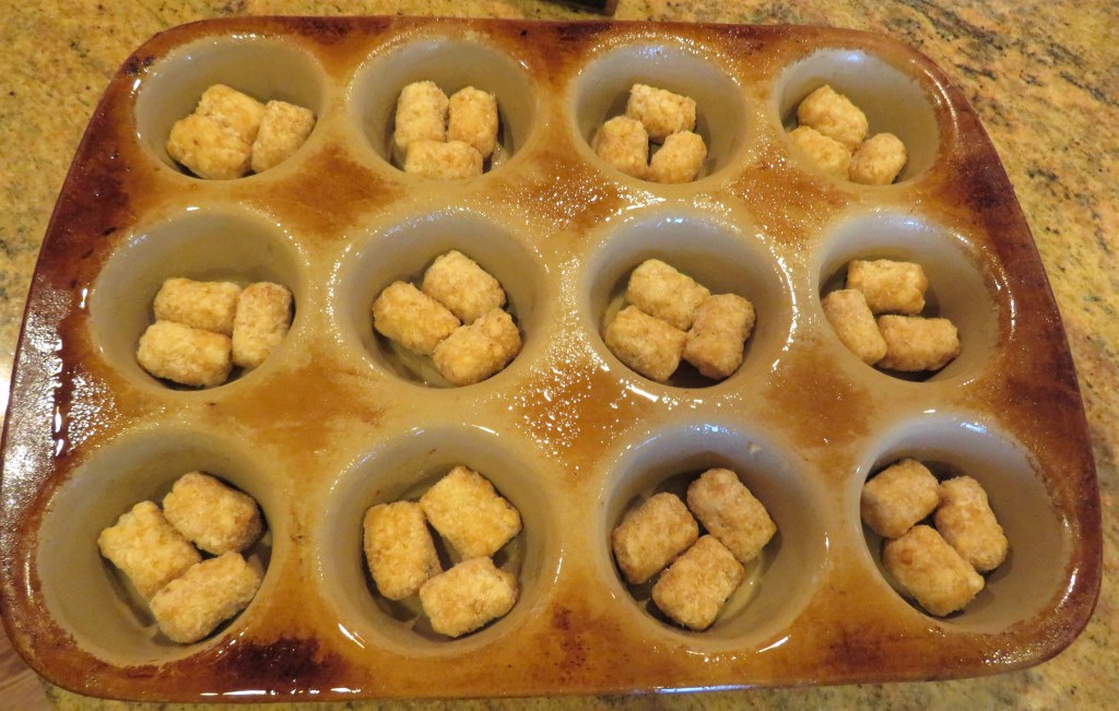 Place 3 tater tots in each muffin slot of the muffin pan and bake for 20-25 minutes or until soft and golden.