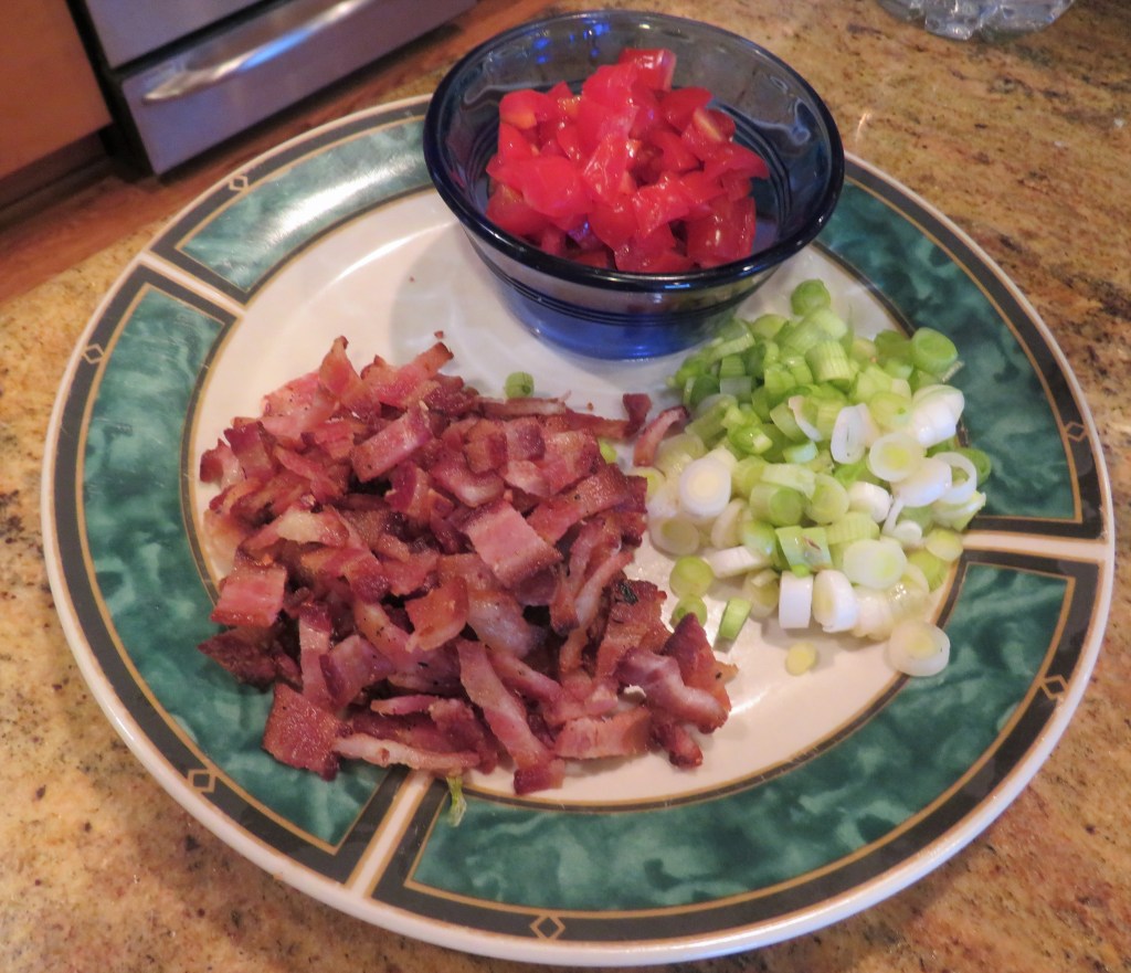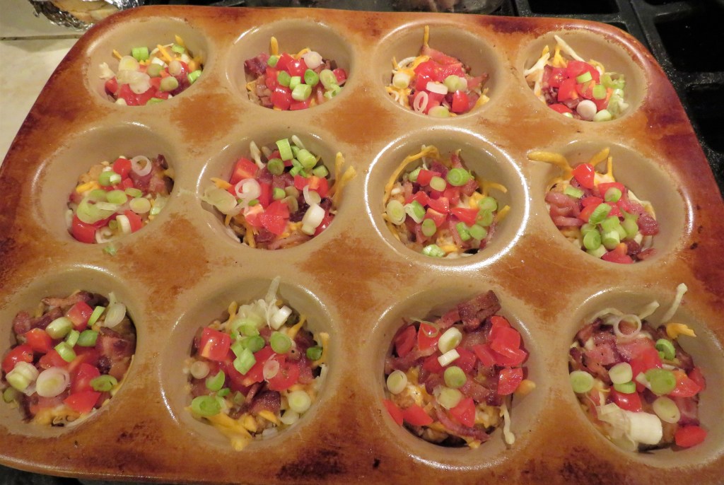 When the cheese is melted, you can dob each nest with a dollop of sour cream if you like, then add the tomatoes and green onions. I did not add the sour cream for us, but instead topped them with ranch dressing, just like I would for loaded potato skins.