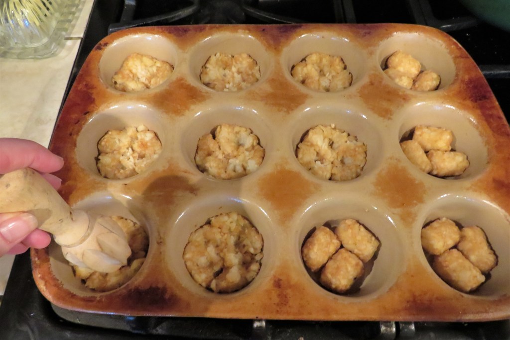 Remove the tater tots from the oven and allow to cool slightly, then make a well in the center of each tot nest. I used a juicer, but you can use whatever you want to make the nest in the center.