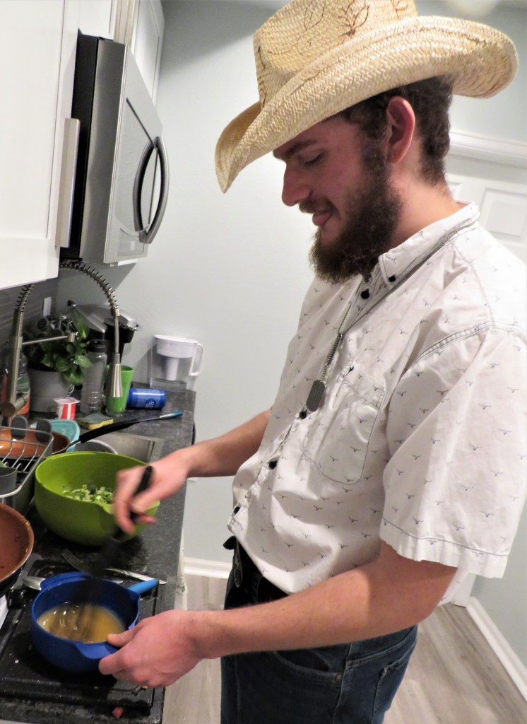 We started off by making a cowboy casserole with tater tots, since that had to cook for about 30 minutes. Noah LOVED this recipe. It was a HUGE hit with him. I think he is proud of the end results. 🙂