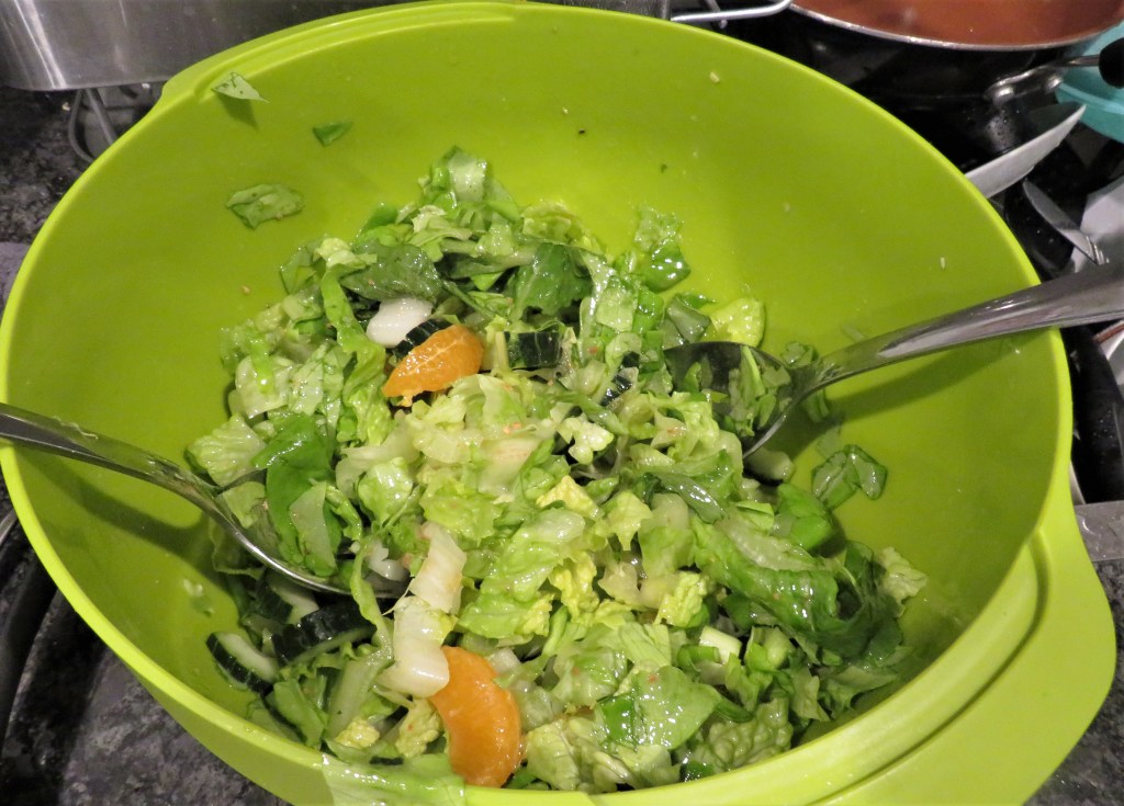 While the cowboy casserole was baking, Noah and I made a salad to go with it. I like to help him with simple and complete meals. Our salad du jour was a simple green and orange salad.