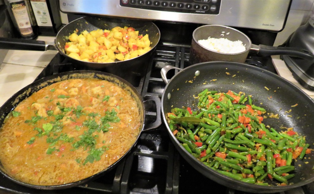 It was my friend Elizabeth’s birthday yesterday, and she wanted me to cook her dinner. She had asked for shrimp curry. Easy-peasy. A curry is just something cooked in a spicy sauce. I did make her a “shrimp curry”, in the form of Shrimp Vindaloo, but I also made a whole feast to accompany the Shrimp Vindaloo too. The cookbook I used had a list of menu suggestions to go with the Shrimp Vindaloo, so I made them all. We had Shrimp Vindaloo, tomato and onion salad, green beans Thoren, potatoes and bell peppers, rice and banana, coconut and cardamom samosas over ice cream for dessert.