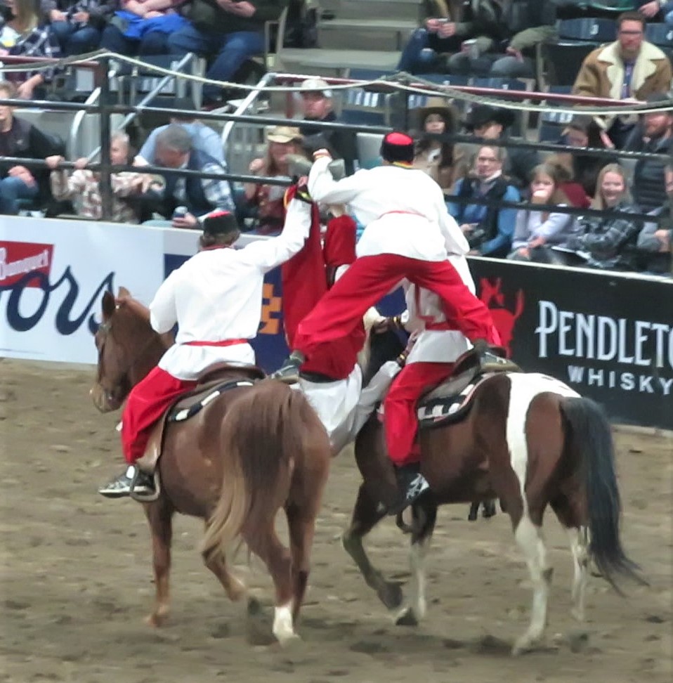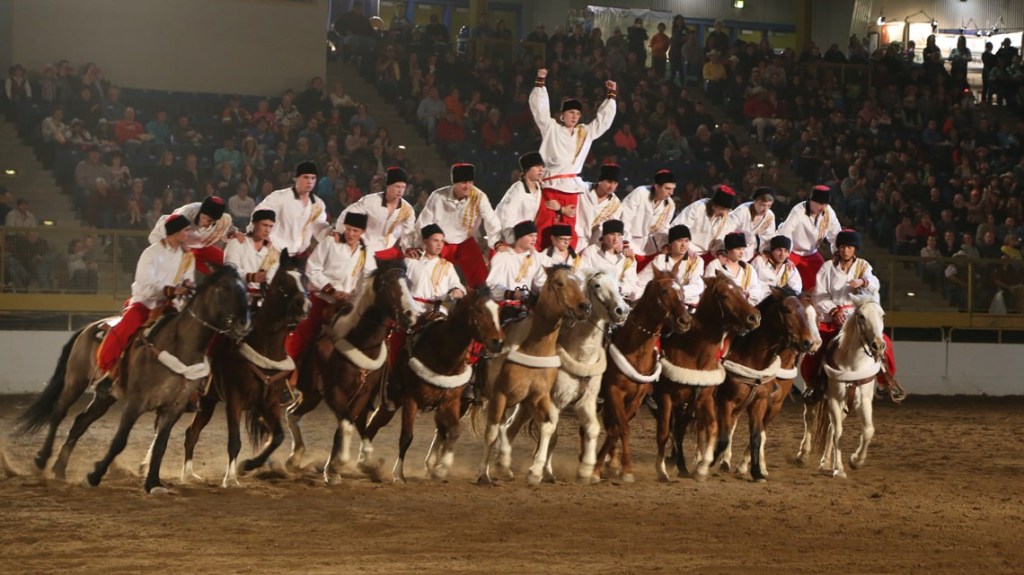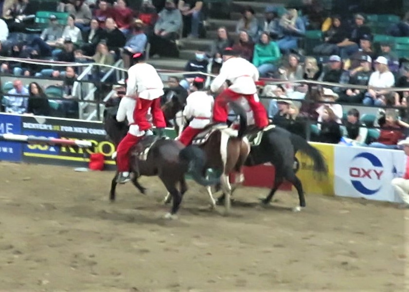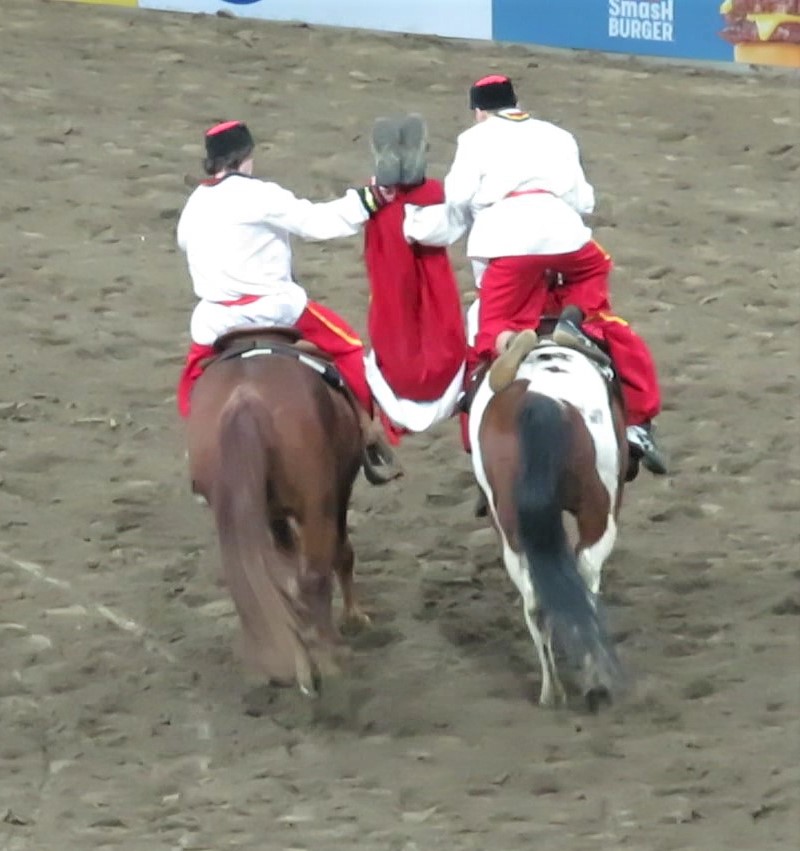 The Cossacks[a] are a group of predominantly East Slavic Orthodox Christian people who became known as members of democratic, self-governing, semi-military communities originating in the steppes of Eastern Europe (in particular the Dnieper, in the Wild Fields. Originally they were highly trained horse soldiers. A lot of the moves they did at the rodeo are skills that were needed on the fields of battle in the military to aid soldiers during war. Fortunately today, they are mostly for show, and what a show the put on too. All of the stunts they did were done while the horses were moving at a very fast pace.