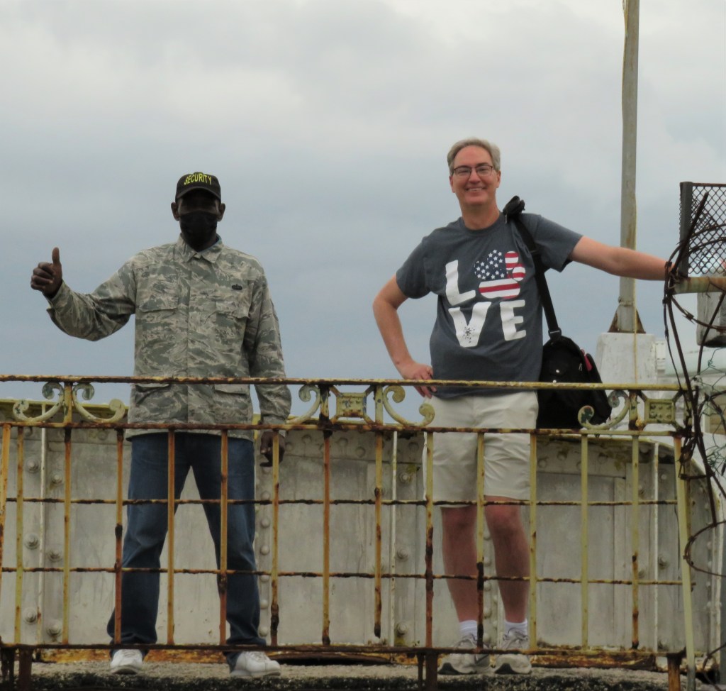 Larry and a friend on the bridge in Belize City before we got onto the ferry. This gentleman was security for the ferry company. I guess they have a lot of problems with the locals.