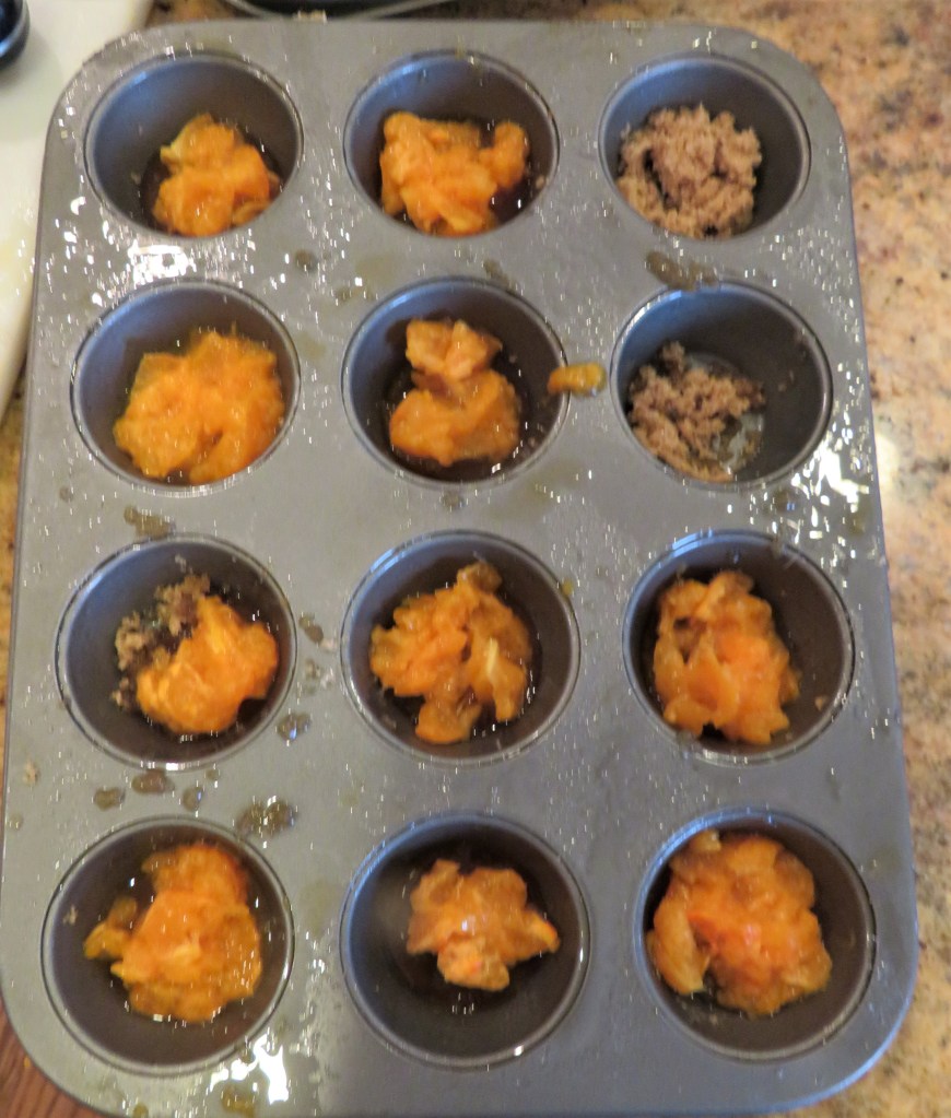 Spray you cake pan or muffin pans with cooking spray. Sprinkle the bottom of the pan with brown sugar. If you are using a larger cake pan, slice the oranges horizontally and line the bottom and sides of the pan with the orange slices, laying them in top of the brown sugar. I used my mini muffin pan, so I chopped the Clementines.