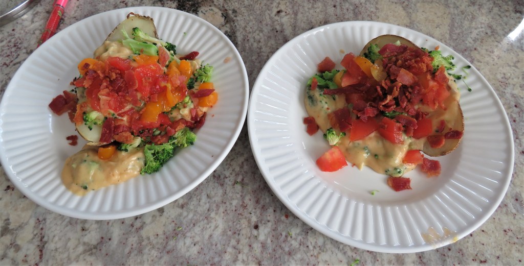 The boys love cheese, so we made these potatoes nice and cheesy. Then we added a lot of broccoli, tomatoes and bacon too. These potatoes were definitely loaded potatoes. They were a meal all by themselves. No need for anything else here.