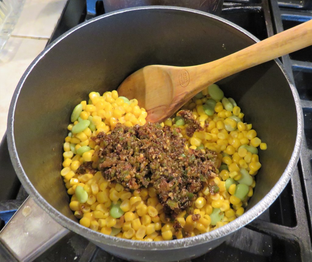While the corn and beans are cooking, in a separate pan, start the spice mixture. Get the pan very hot then add the butter and oil. Combine all the rest of the ingredients into the pan and saute for about 5 minutes, stirring constantly.