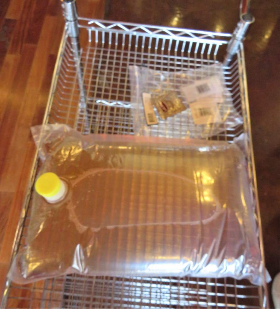 Larry calls this instant wine, or wine in a bag. Regardless of what form it comes in, it is still a fun experience to say “you make your own wine”. Here are all the ingredients we needed; the bag of juice, yeast and a few other secret ingredients. From here, just add water.