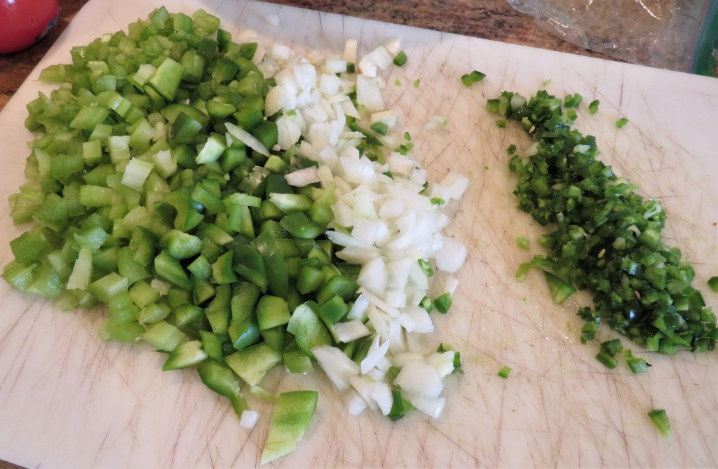 The word etouffee is a French word that means smothered. An etouffee is a sort of stew that typically consists of a roux, the Holy Trinity (onion, celery, and bell pepper), some garlic, hot sauce, and either shrimp, crawfish, or chicken. Because I like things with a kick, I usually make my Holy Trinity the Holy Four by adding jalapenos as well.