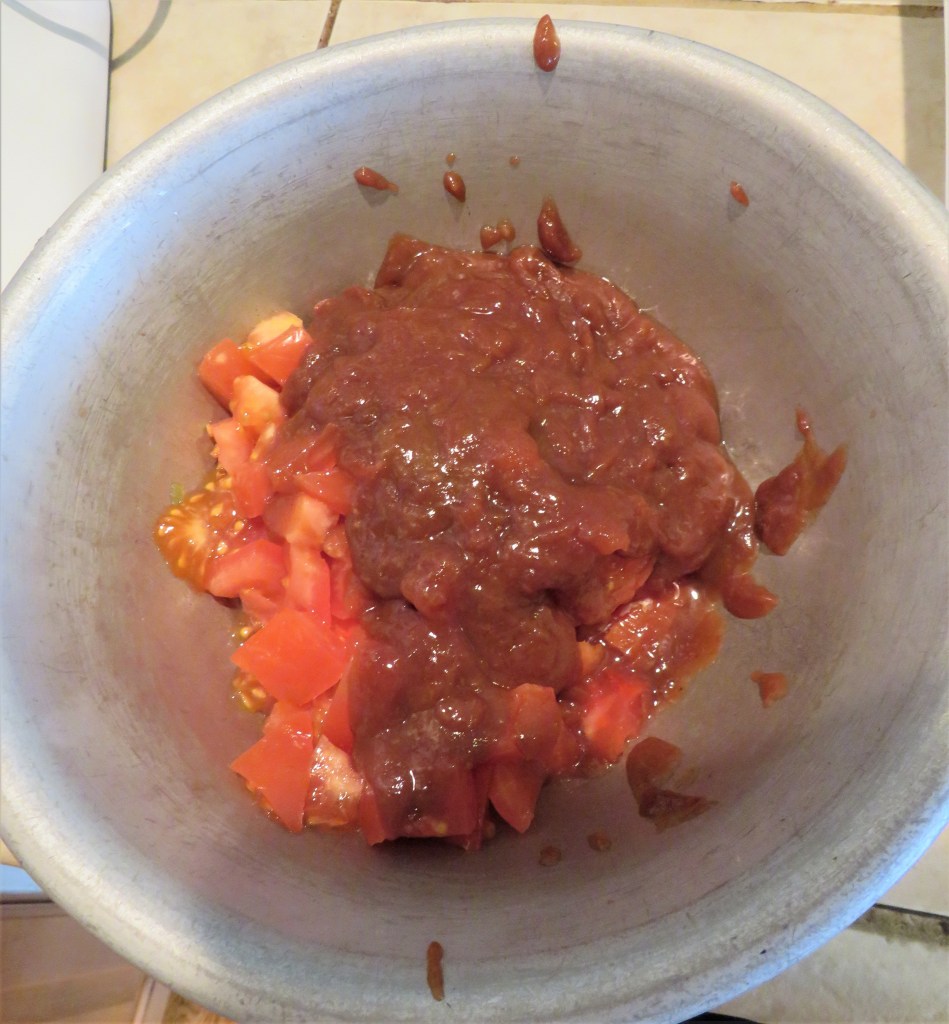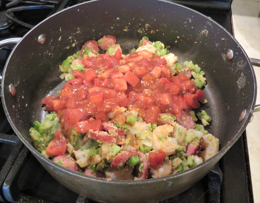 Mix the tomatoes and tomato sauce together and add to the vegetable mixture. I added some cocktail sauce instead of tomato sauce, for a little extra zip.