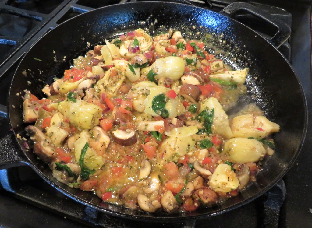 I started off by cooking the heartier vegetables first in some lemon olive oil; the onions, pepper, mushrooms and garlic. Then added the rest a few minutes later.
