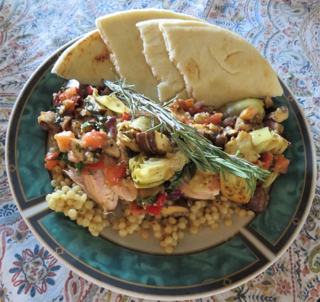 I cooked it all just long enough to heat it all up thoroughly before layering it all up on a bed of pearl couscous. Couscous first, then the chicken (heated in the microwave), followed by the vegetables, with warmed pita bread on the side. And of course there was wine! I added a cool, crisp Verdicchio, the latest wine that we just made. A Lot of Wine, A Lot ofย Fun YUM! A quick and easy-peasy Mediterranean dinner is served. My kind of meal!