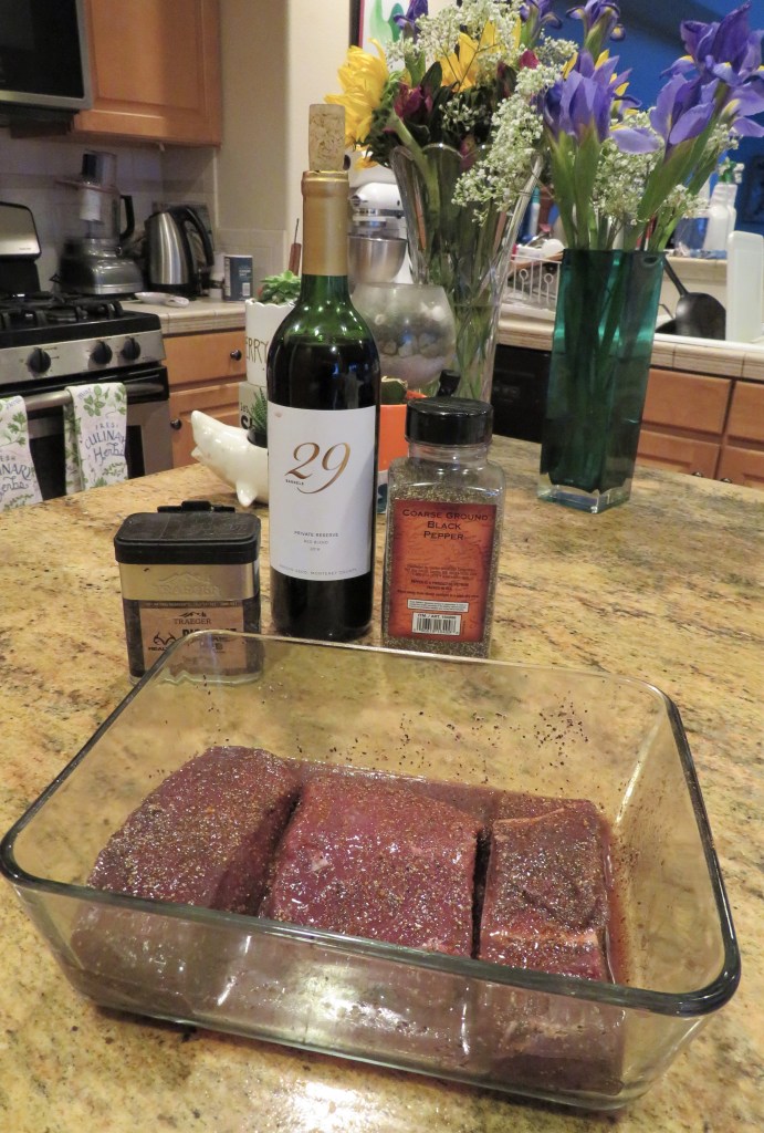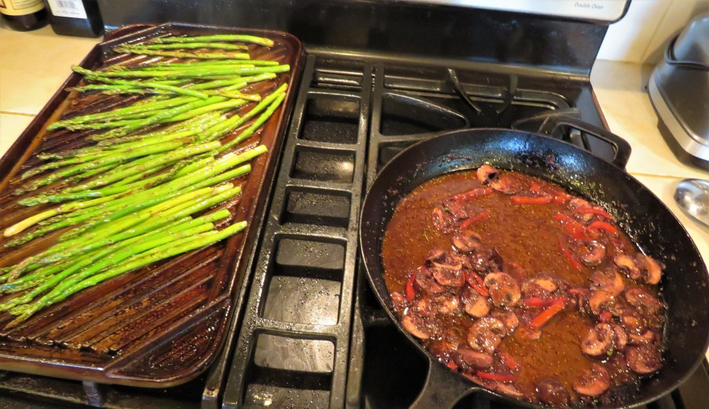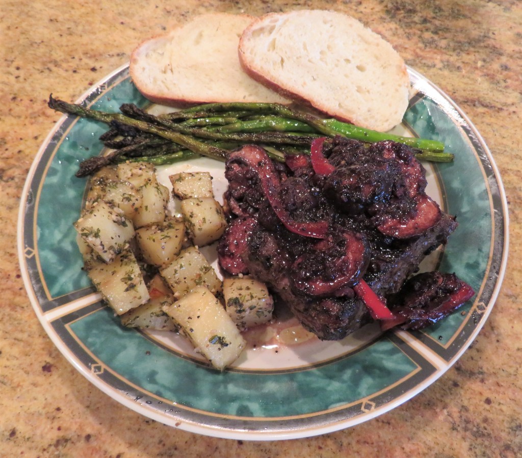 Last night, Larry had an old friend from high school visit us and I wanted to cook up something that was a true Colorado meal. Larry’s friend Mark lives in Austin, TX so it was a bit challenging because Texas, like Colorado, is known for its beef and good Mexican and Southwestern foods. So I went with some wild game. I know, Texas has wild game too, but as far as I know, they don’t have elk. I decided on making some elk steaks with a port reduction sauce with mushrooms and peppers, roasted rosemary and garlic potatoes and grilled asparagus. I decided on making a true Colorado meal that focused on our natural wild side.