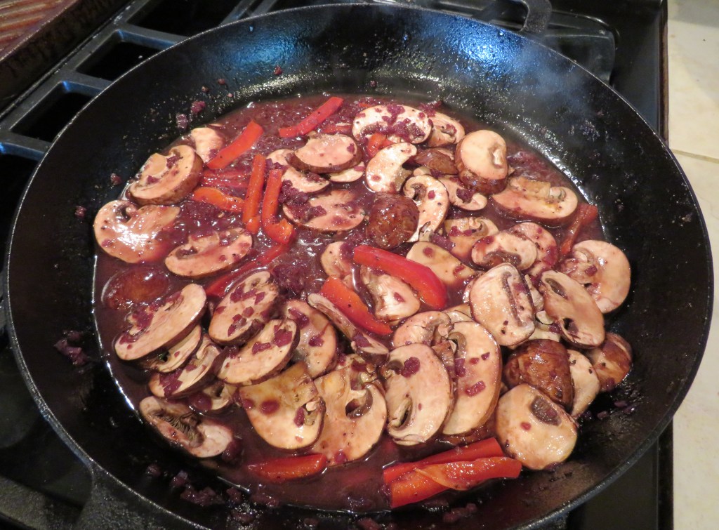 As the steaks were grilling up, I made a port reduction sauce and added some mushrooms and red peppers as well.