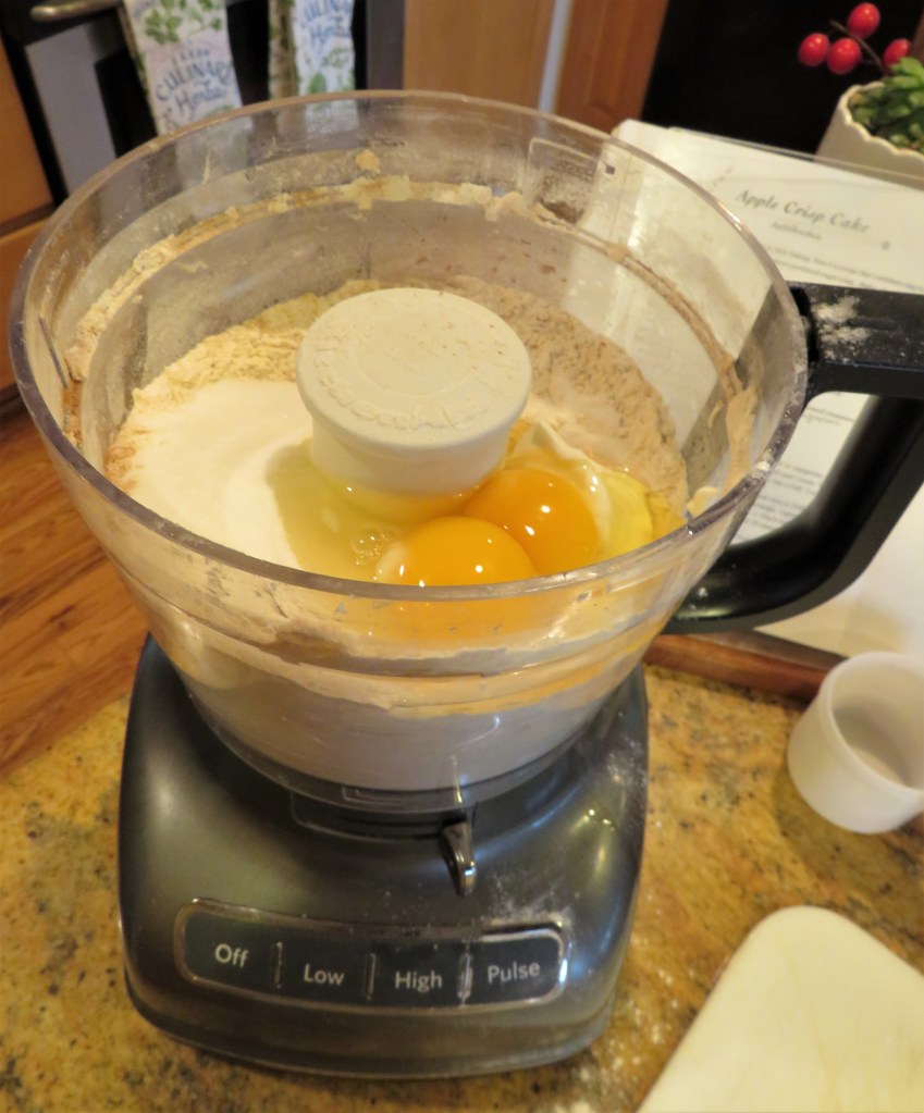 Combine the flour, salt, butter, cinnamon and baking powder in food processor and pulse until it all resembles a course sand. Then add the eggs, sour cream and sugar and blend again until it all forms together into a ball. Wrap the ball in plastic wrap and chill in the refrigerator for at least 2 hours, and up to 24 hours before using.