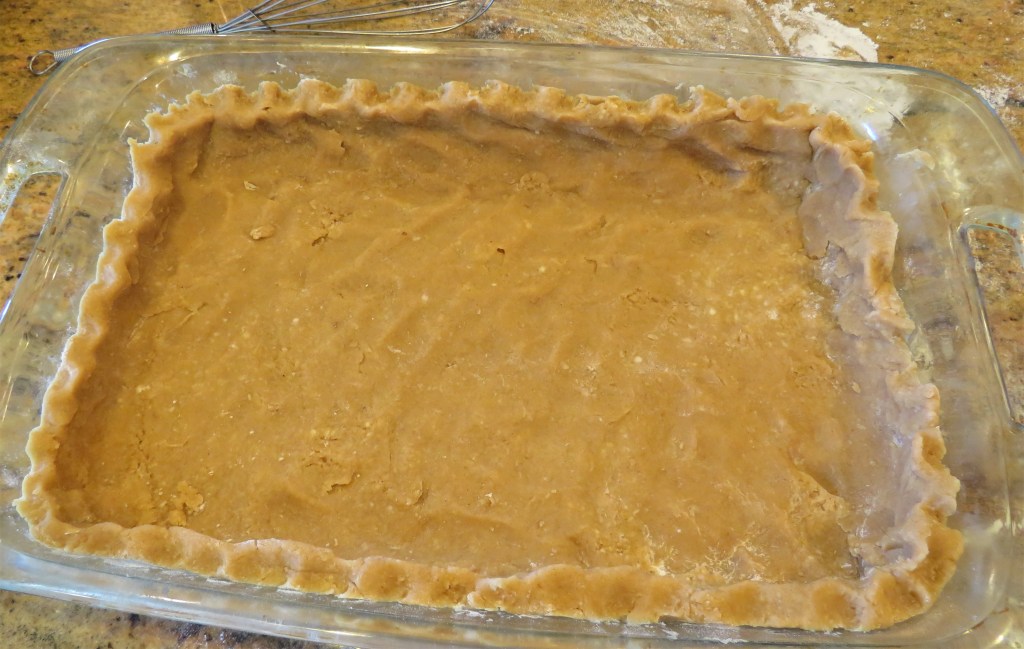 Remove the dough from the refrigerator a few minutes before you are ready to press it into the 9×13 baking dish. On a lightly floured surface, roll the dough into a rectangle then add it to the baking dish. Completely press it into the pan and up around the sides. Crimp the edges.