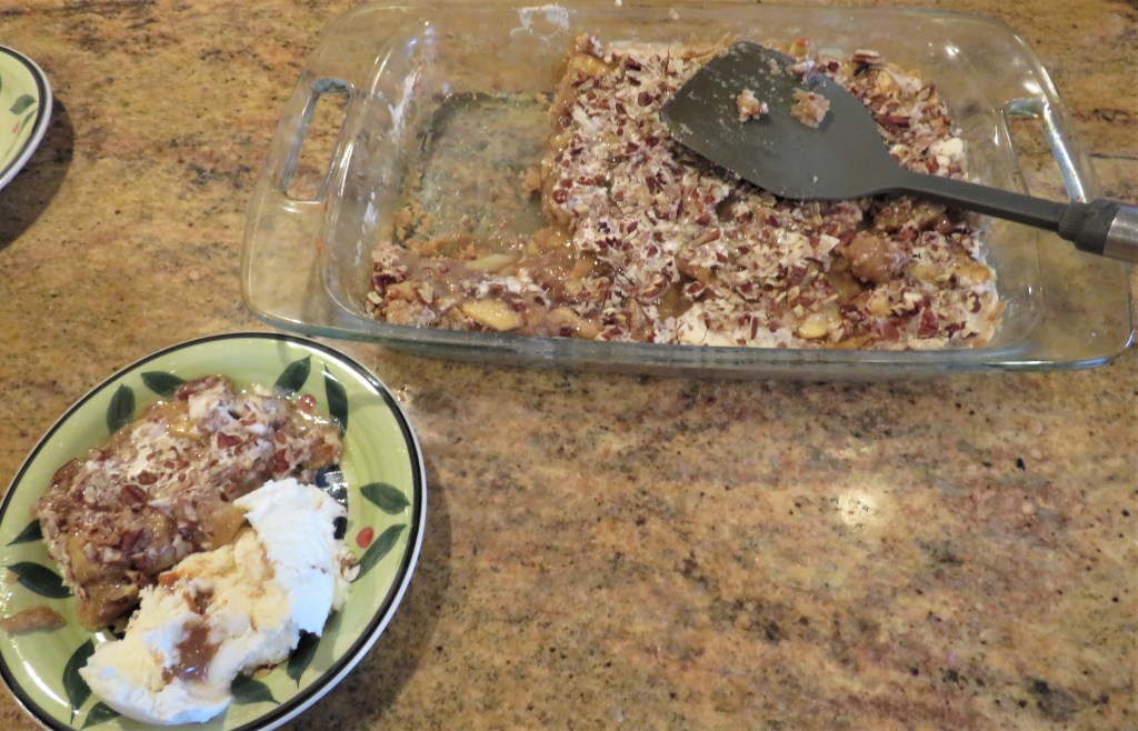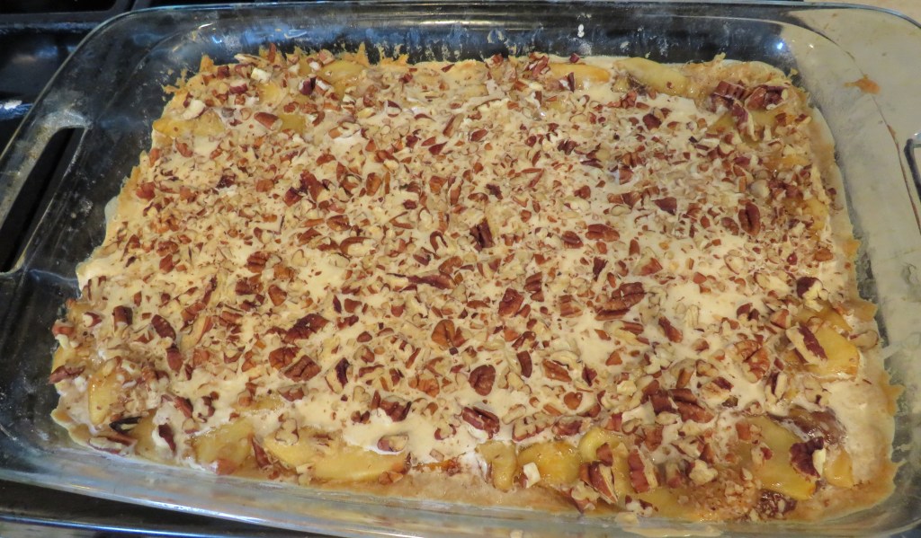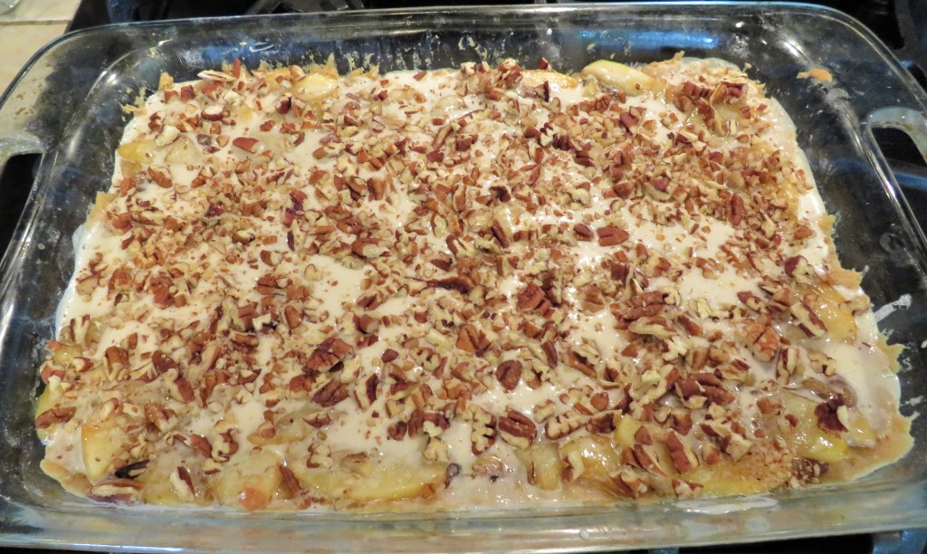 Then pour the icing over the apples and spread evenly to cover them. Sprinkle the chopped pecans evenly over the icing. Bake again for an addition al 10-15 minutes.