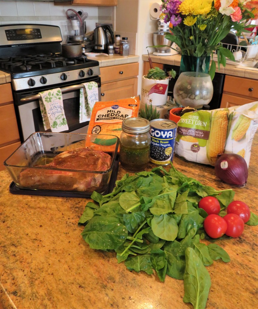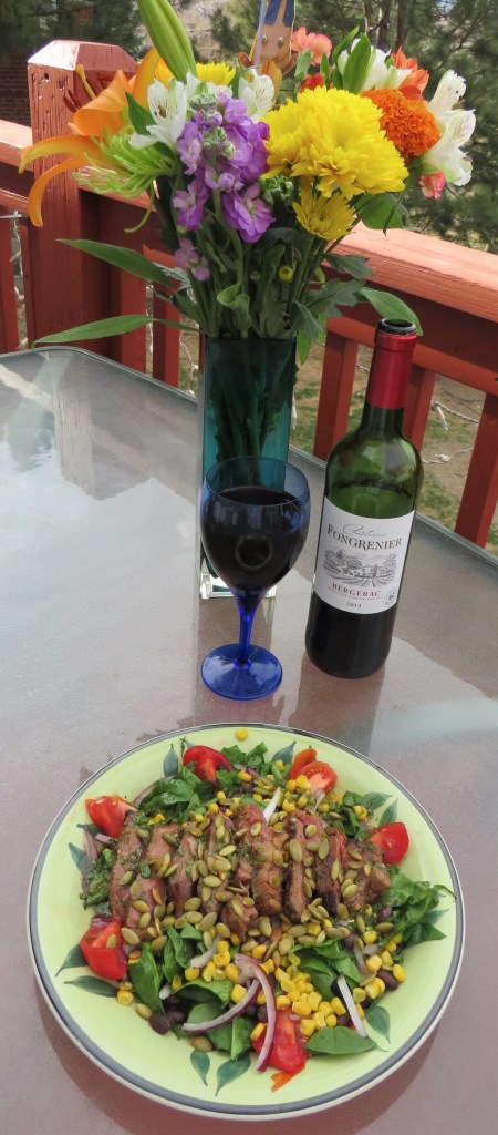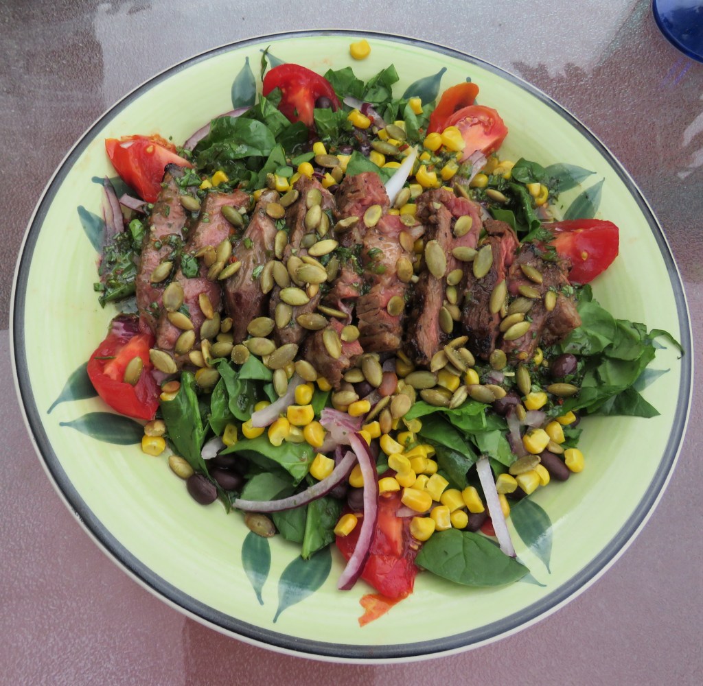 I made yet another Southwestern steak salad that was full of all kinds of healthy colors and fresh goodness. I mention colors because it is a good rule of thumb that the more “colors” your foods contain, the more healthy they are too. The reasoning behind this school of thought is that you are are eating a wide variety of fresh fruits and vegetables. So color up your foods, especially during spring and summer when there are so many fresh fruits and vegetables from which to choose.