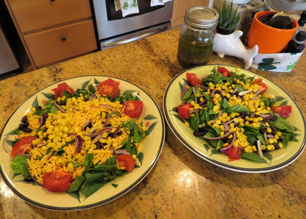 Rather than lettuce, this time I chose to put everything on a bed of spinach instead. Larry likes a lot of cheese on his salads, and I don’t like any on mine. This is just a simple salad, filled with simple items. Put together, they were all delicious. I made these salads for two, and didn’t really measure anything. You can use as much or as little as you like, depending on how many people you are making it for.