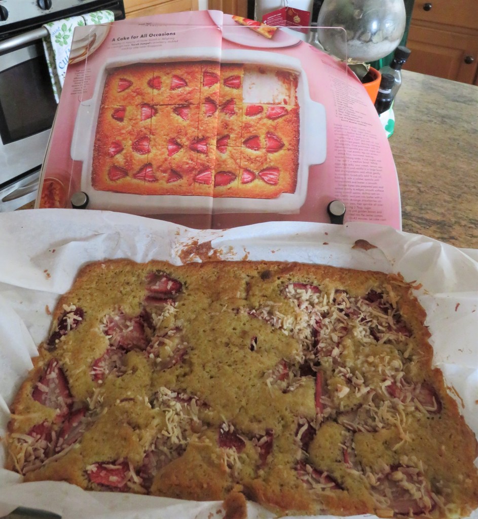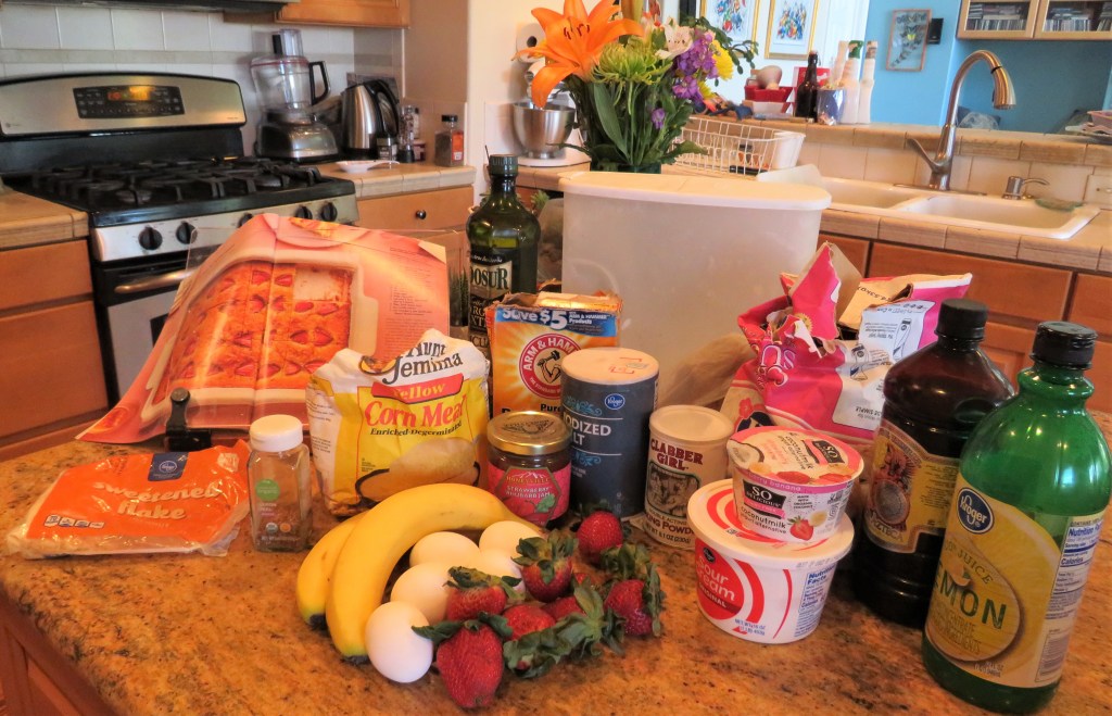 I like using a lot of fruits for my desserts during the warmer seasons. Plus I am always on the lookout for new and different ideas for my coffee cart. I saw a recipe for a strawberry cake, but I wanted to add bananas too, because I had some strawberry-banana yogurt. Then I thought of making it even more tropical by adding coconut to it as well, again, since my yogurt was made from coconut milk. There was a bit of a theme going on, all based on that one container of yogurt. 🙂 I haven’t tried it yet, but I just know it will be good.