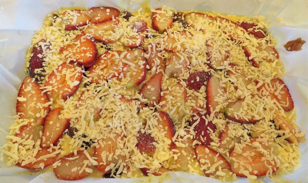 Add the sliced strawberries and then sprinkle the coconut on top of the strawberries.