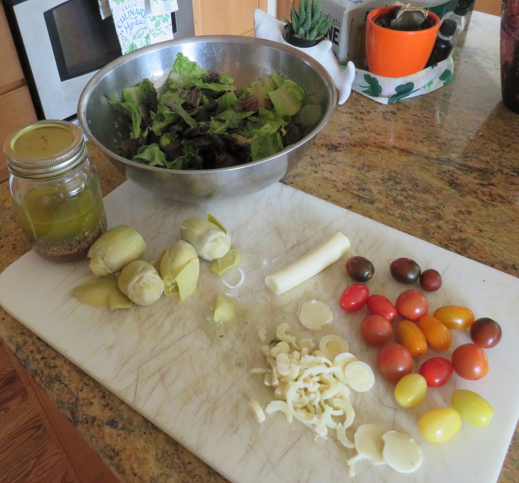 For the salad, I used some red leaf and green leaf lettuce, mixed with artichoke hearts, tomatoes and hearts of palm and toasted almonds. I tossed it all together with a fresh, lemony vinaigrette. YUM!