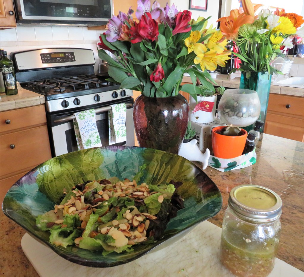 Whisk everything together until well blended and set aside until ready to use. I usually do not put my dressings on my salads until just before I am ready to serve them.