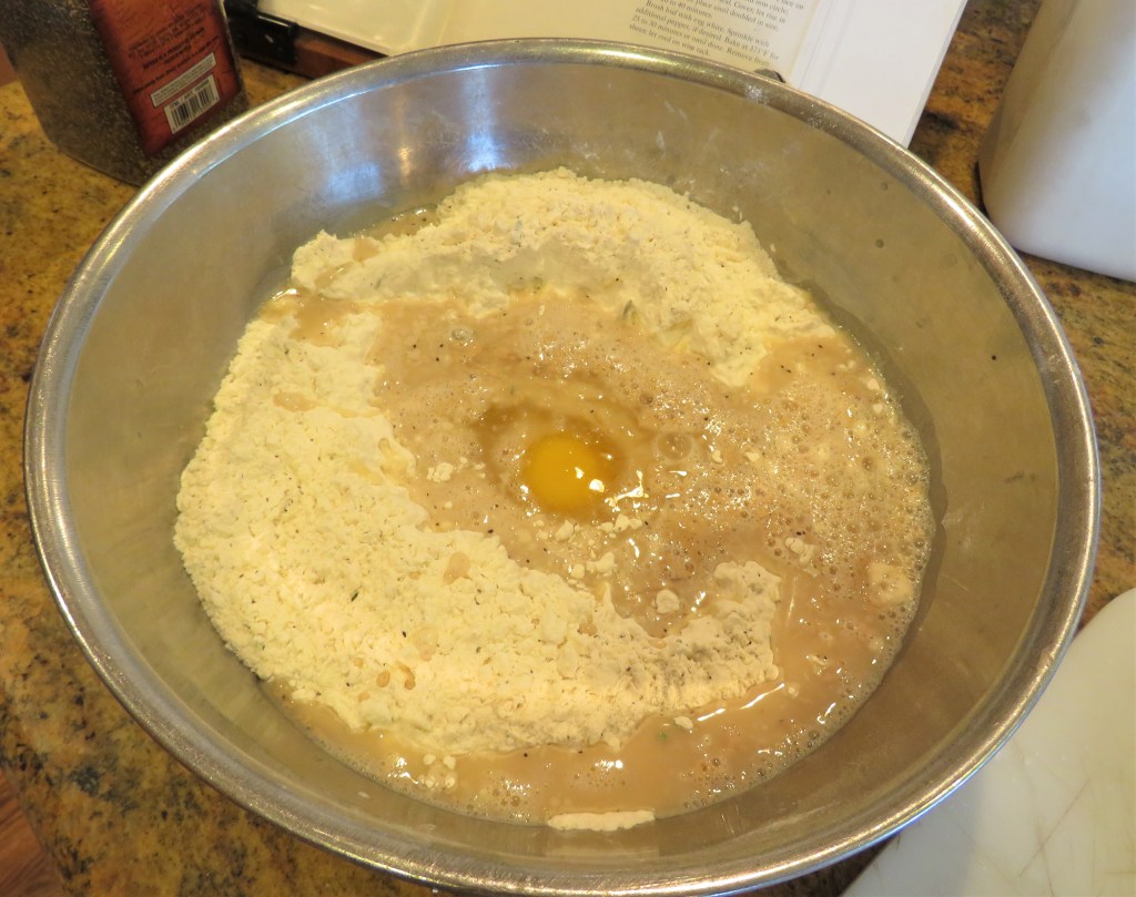 Make a well in the center of the flour mixture and add the egg and the yeast mixtures. Start from the center and work your way out, and incorporate the flour mixture with the egg and yeast mixture.