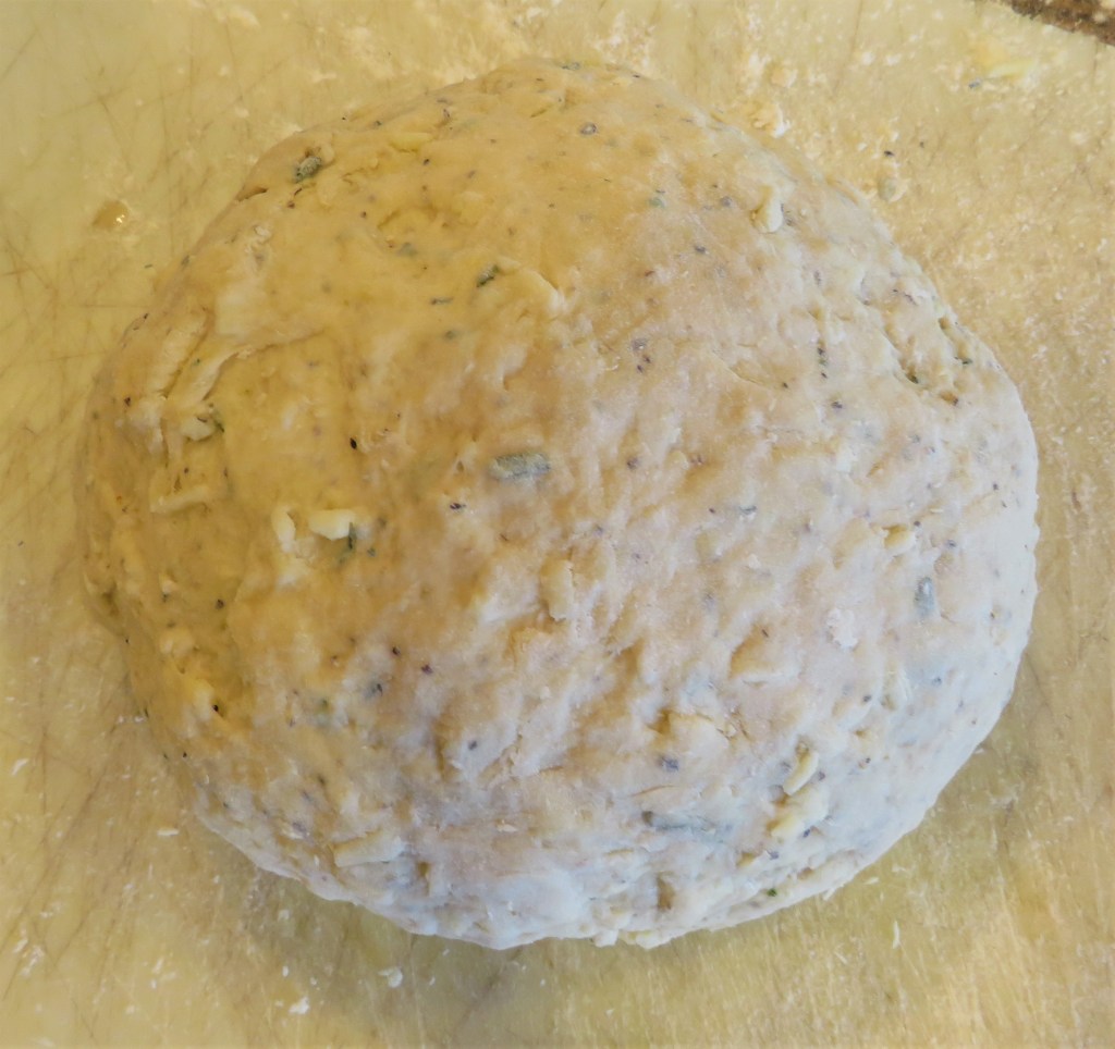 Combine the flour, cheese, sage, salt and pepper together and mix well. The amount of flour is going to vary depending on where you are. Start with 3 1/2 cups and add more later if needed. I only needed the 3 1/2 cups, and the dough was nice and soft.