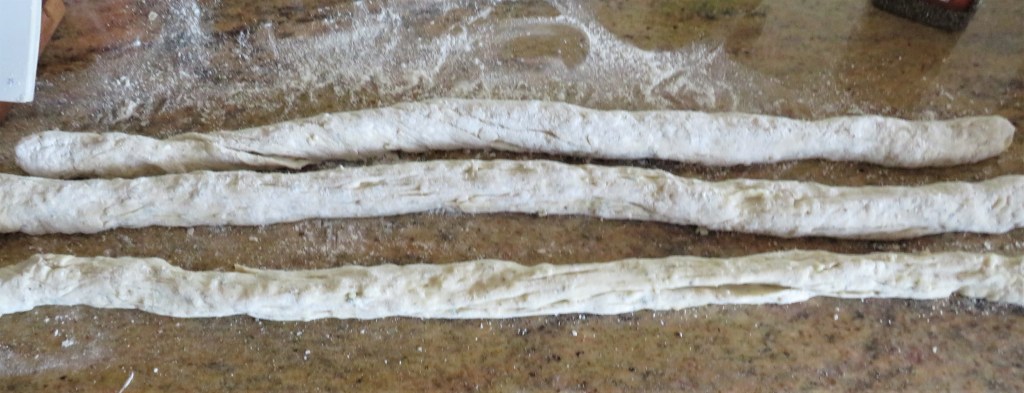 When the dough is ready, divide into 3 equal portions and roll out into long ropes, about 28 inches long.