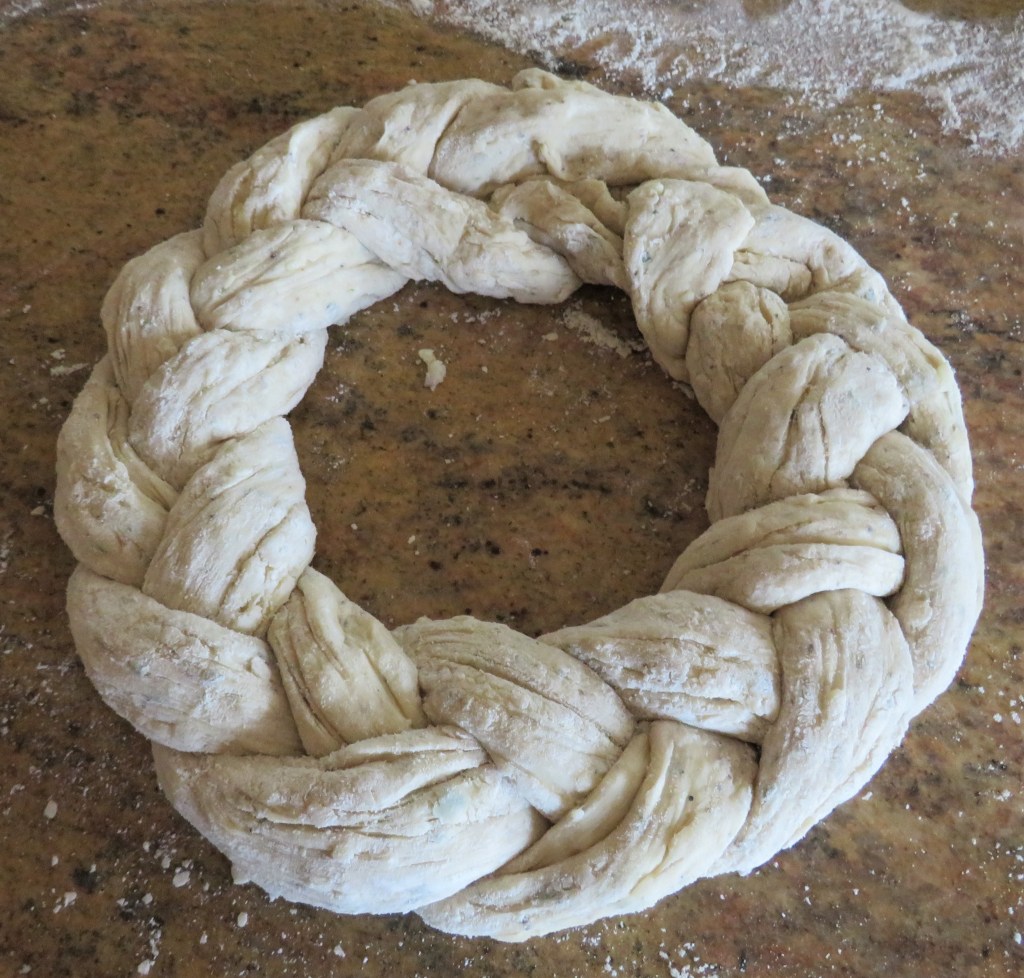 Carefully mold the braided dough into a round wreath and connect the loose ends together. Cover and let rise again for an additional 40 minutes.