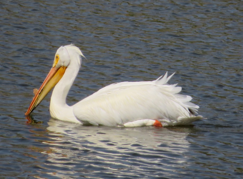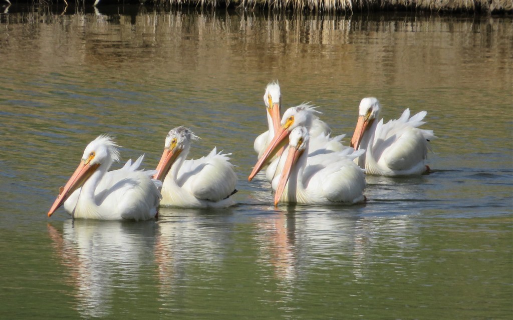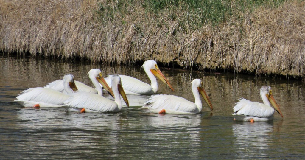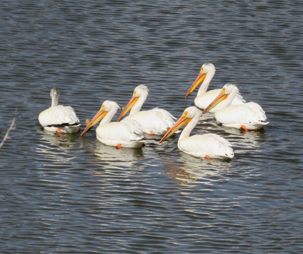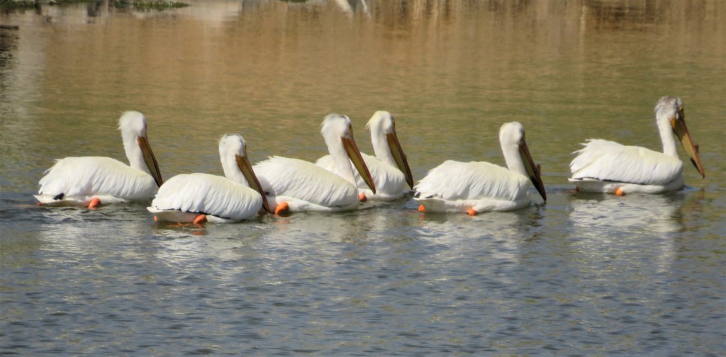 I was outside with Juneau and Vinnie when I saw a few pelicans out swimming on the first lake. So I ran inside and got the camera and took these shots from my deck. There were six pelicans, all swimming together, doing their synchronized swimming for the day. They all turned in the same direction and would follow the leader. If one would dip down for a drink, they all would. If one switched directions, they all did. They did that for quite awhile until one pelican decided he had had enough and was ready to do his own thing instead. There is always one of those individualists in the crowd. Usually it’s me. 🙂