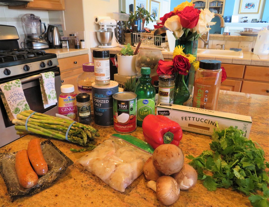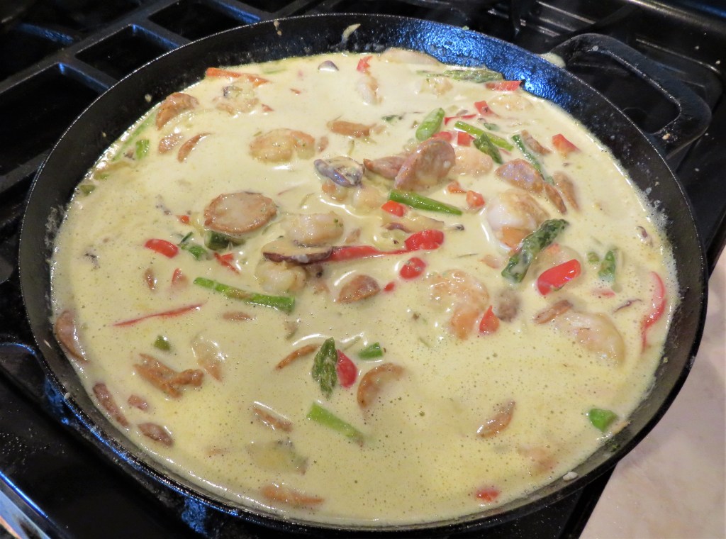 My latest curried adventure was a green Thai-styled curry with both shrimp and chicken chorizo, combined with vegetables. I served it over fettuccine.