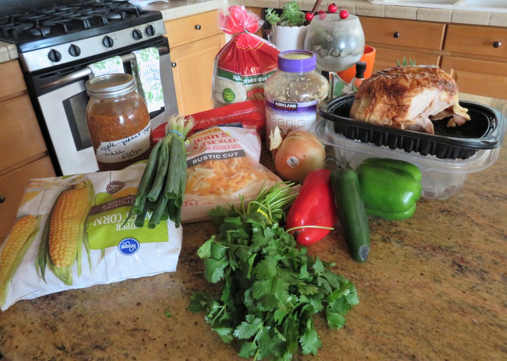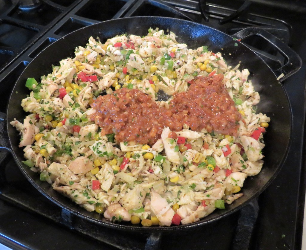 For the chicken filling, I used some leftover Costco rotisserie chicken, along with corn, red and green bell peppers, jalapeno peppers, garlic, onions, cumin, oregano, salt & pepper, olive oil and lime olive oil, cilantro and a bit of my mole mixed in.