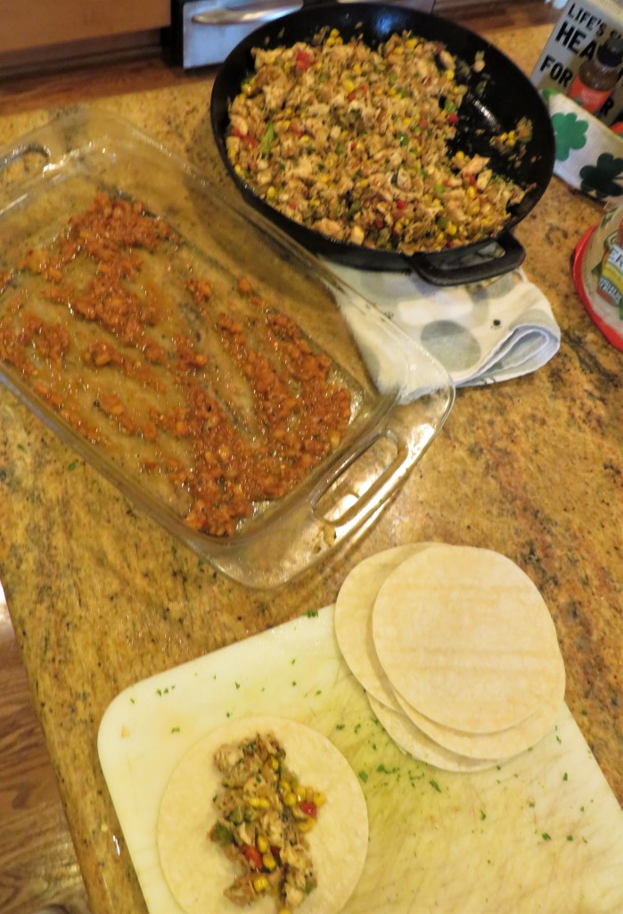 Once everything was cooked, it was time to roll up the enchiladas. I debated on whether to roll them or to layer them. I do both, and it really just depends on my mood at the time. This time, I rolled them.